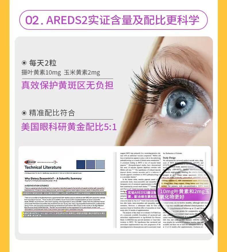 根據美國國家眼科研究所(NEI) 提出的AREDS2配方研究經過10年數據追蹤,3887人蔘與表明每天攝入:葉黃素:玉米黃(黃金配比5:1)+維生素、礦物質+抗氧化劑可降低20%中度至晚期AMD(老年性黃斑變性)患者發展風險。