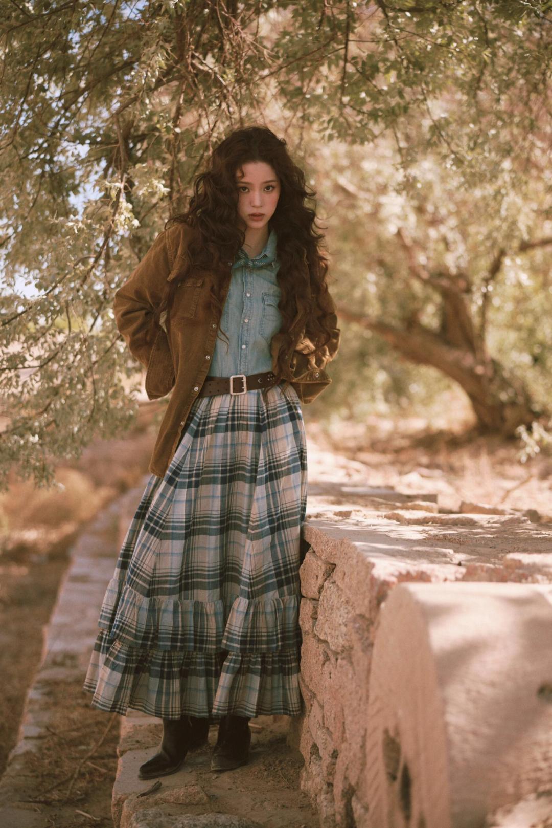 歐陽娜娜燈芯絨外套+格紋裙+靴子的搭配,很有西部風情。▼