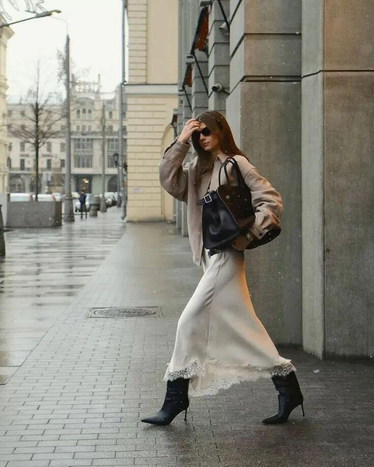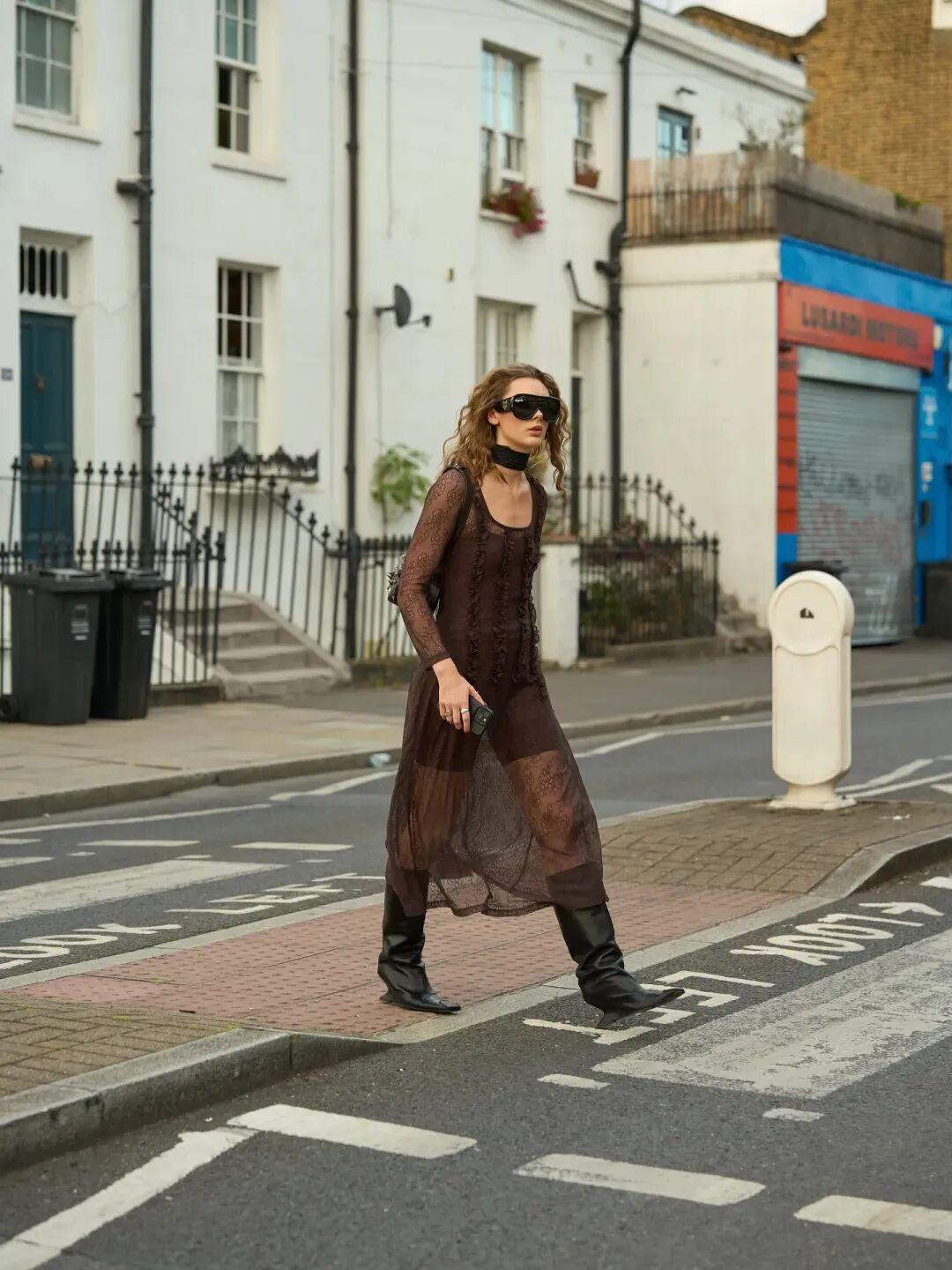 今年最出圈的穿法,就是用柔軟的緞面、蕾絲或紗裙,去搭配硬朗的皮衣皮靴,兩種氣質平衡得剛好,又美又颯。▼