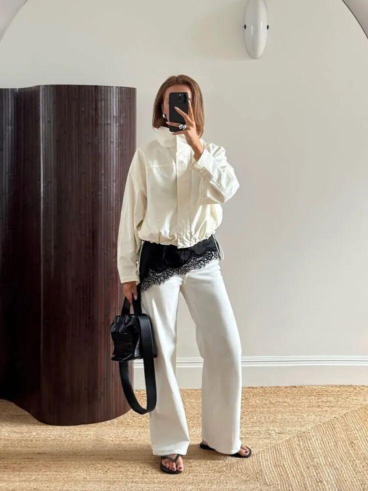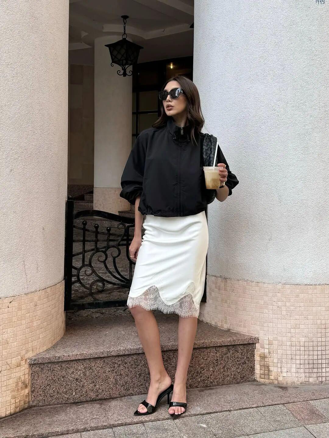 這個組合的魅力就在於風格的碰撞和反差感:抽繩運動夾克負責活力休閒和戶外感,緞面裙/緞面蕾絲裙重點在於精緻、浪漫。▼