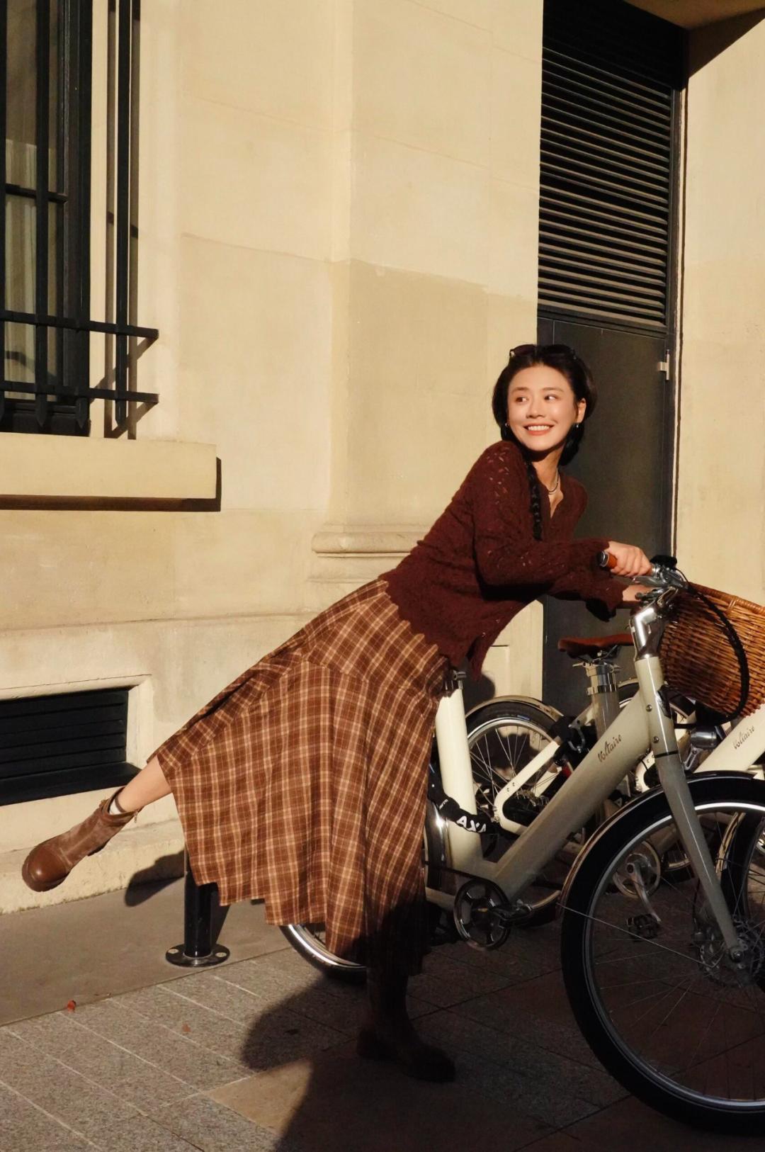 馬思純去巴黎參加時裝週,就穿了棕色短靴+格紋裙的組合。▼