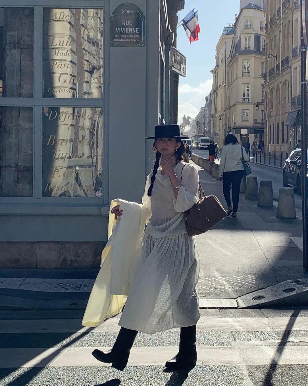 鍾楚曦穿了短裙+長靴的組合,在巴黎出了不少美圖。