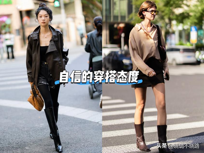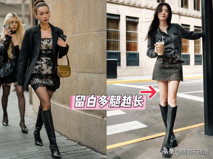 “露多少”是一門精確的科學。上海女生對此掌握得恰到好處。短裙的理想長度通常控制在大腿中部,這個位置能最大程度地展現腿長,又不會因過短而顯得不夠得體,我們可以選擇短一點的長靴,因爲留白越多越顯腿長。這一小段“留白”至關重要,它在視覺上分割了腿部和靴子,避免了沉悶感,並通過清晰的腿部線條展示,進一步優化了整體的纖細感和長度。這種對細節的苛求,是讓普通穿搭進階爲時髦造型的關鍵一步。