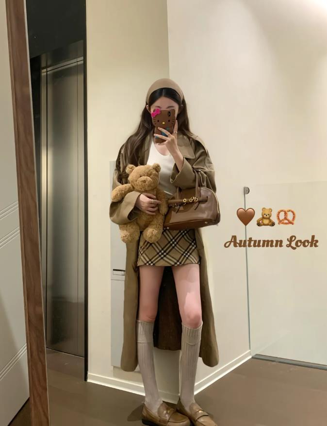 很喜歡這種帶點甜酷感的穿搭,卡其色長款風衣,就這麼敞開來穿,營造出隨性大氣範,內搭白色上衣,下身是一條格紋短裙,露出腿部線條,視覺上很顯高挑,搭配淺灰色長襪和棕色樂福鞋,復古又充滿和諧,手裏提着棕色包包,秋日氛圍感直接拉滿。
