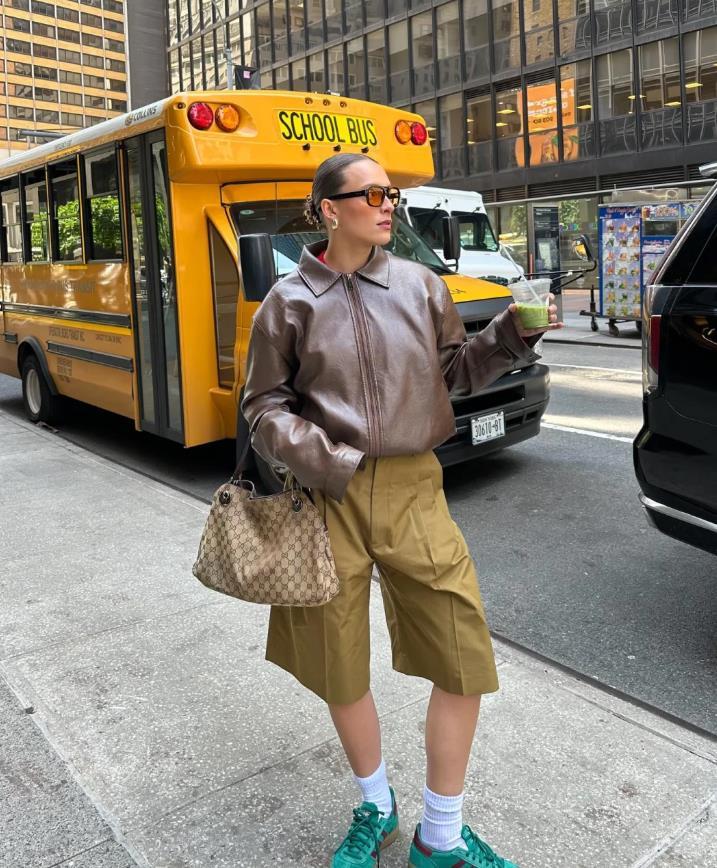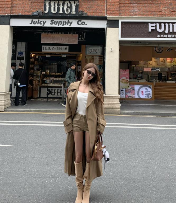 這一套穿搭走的是輕熟颯爽風格,卡其色的長款風衣,真的是每年秋冬都會流行呢,內搭白色吊帶,下身配的是一條與風衣顏色一致的短褲,就這麼露出大部分腿部線條,結合長靴來穿,瞬間就把腿部線條給拉長了,再加上墨鏡的加持,自在灑脫還不失魅力。
