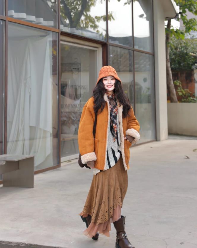 喜歡復古文藝風穿搭的,就可以借鑑下這套,暖橙色的毛絨外套,穿起來就非常溫暖吸睛,內搭格紋圍巾與拼色毛衣,增加了造型層次感,下身搭配鏤空半身裙,裙襬不規則的設計,盡顯個性,腳上穿的棕色皮帶扣長靴,帽子顏色與外套一致,和諧又充滿氛圍感。