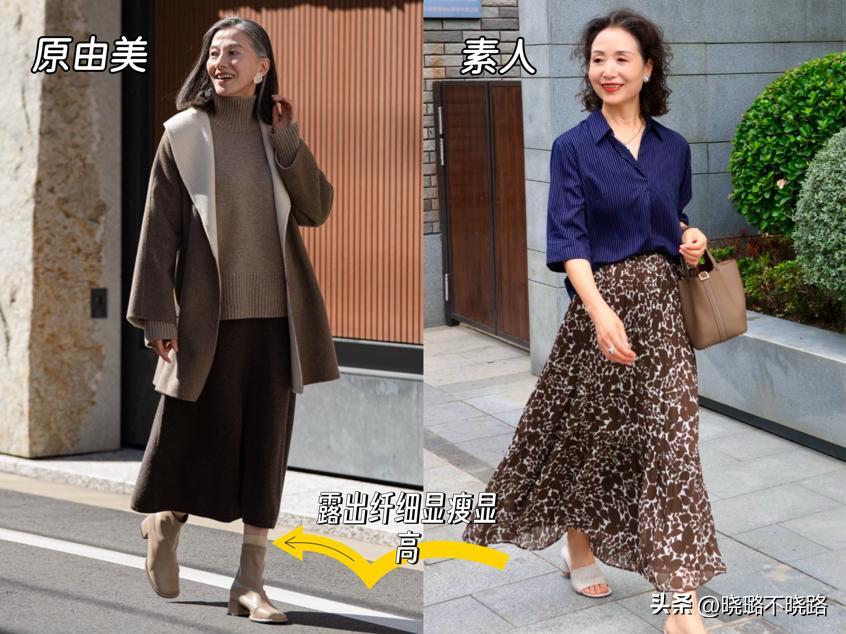 裙長是氣質的開關。原由美深諳此道,她的寬鬆裙長度總是精準地控制在膝蓋下方約3釐米處。這個長度堪稱“黃金尺度”:它足夠得體,避免了超短裙與年齡的違和感;它也足夠實用,能巧妙地遮蓋住大腿最粗壯的部分以及可能存在的膝蓋腿型不直等小瑕疵。
