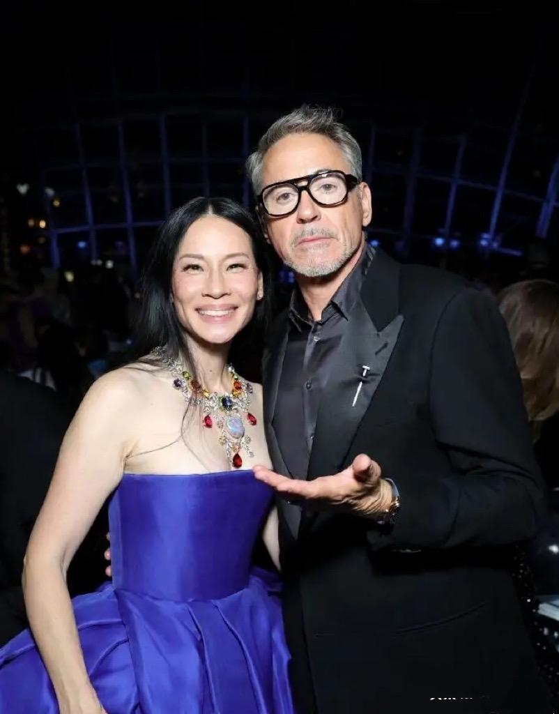 這次小羅伯特 唐尼,終於摟着劉玉玲合影了。劉玉玲脖子上的寶石太醒目了,讓小羅伯特看到她了。