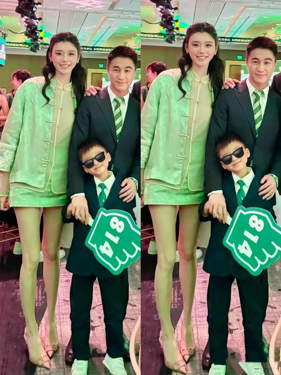 奚夢瑤爲了這次活動也很用心,給父子倆的打扮也很協調。雖然是穿着黑色西服套裝,但是領帶、袖口都點綴了綠色系,簡約幹練中又與整體的環境很搭。