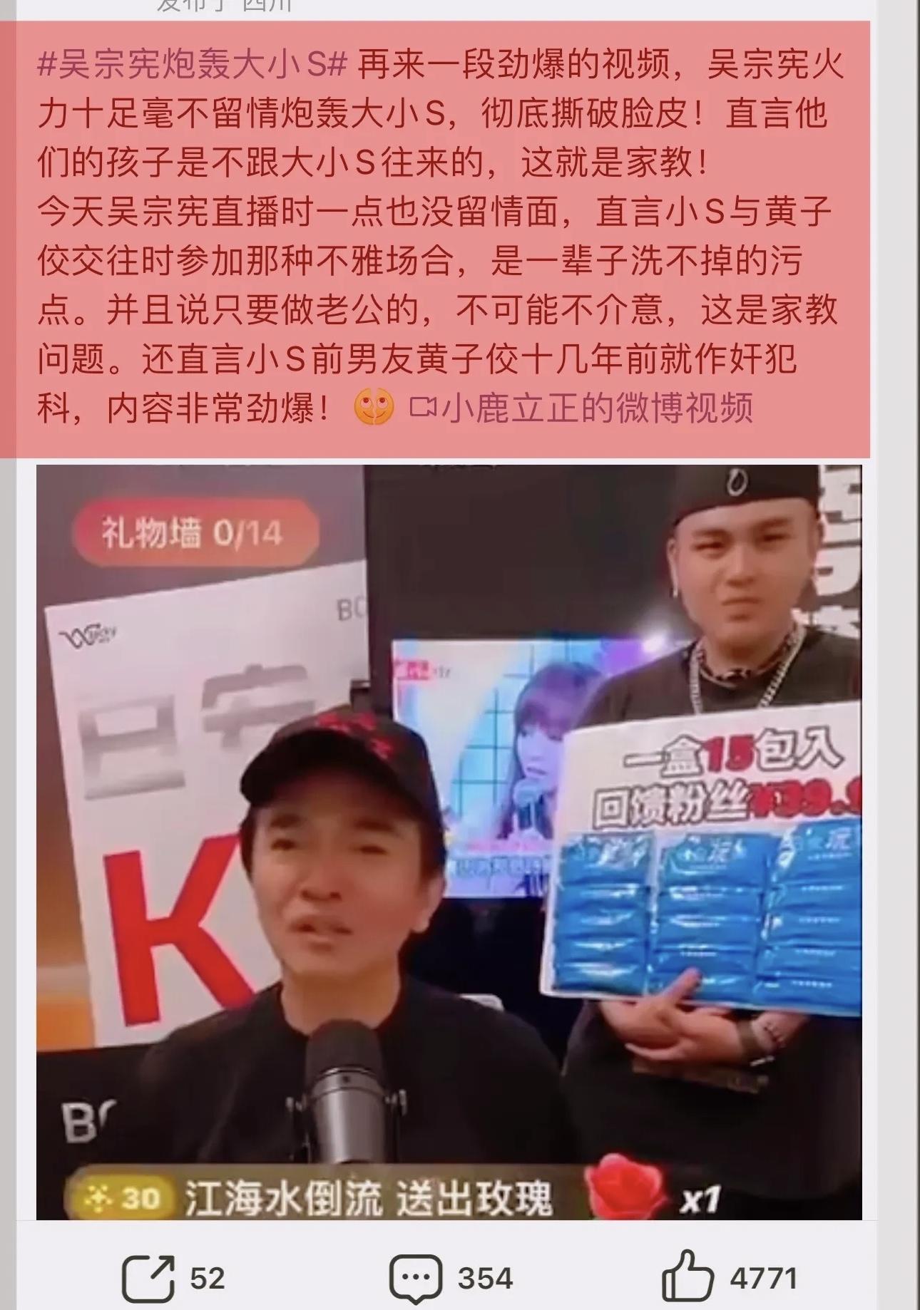 這件事情的熱度很高,吳宗憲三番兩次拿大小S的事開涮。他在直播間裏不停的抖擻,小S沒有給出任何回應,一直都保持沉默,有一種“不想搭理”的嫌棄感。
