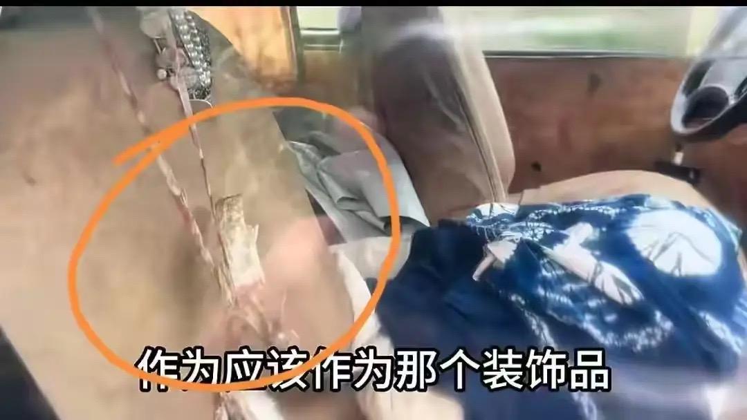 其實他們家的放車裏首飾的也挺乾淨,有很多毛絨玩具、佈置的還是挺溫馨的。在車座位上還有一個骨頭形狀的裝飾品,大概是辟邪用的吧。
