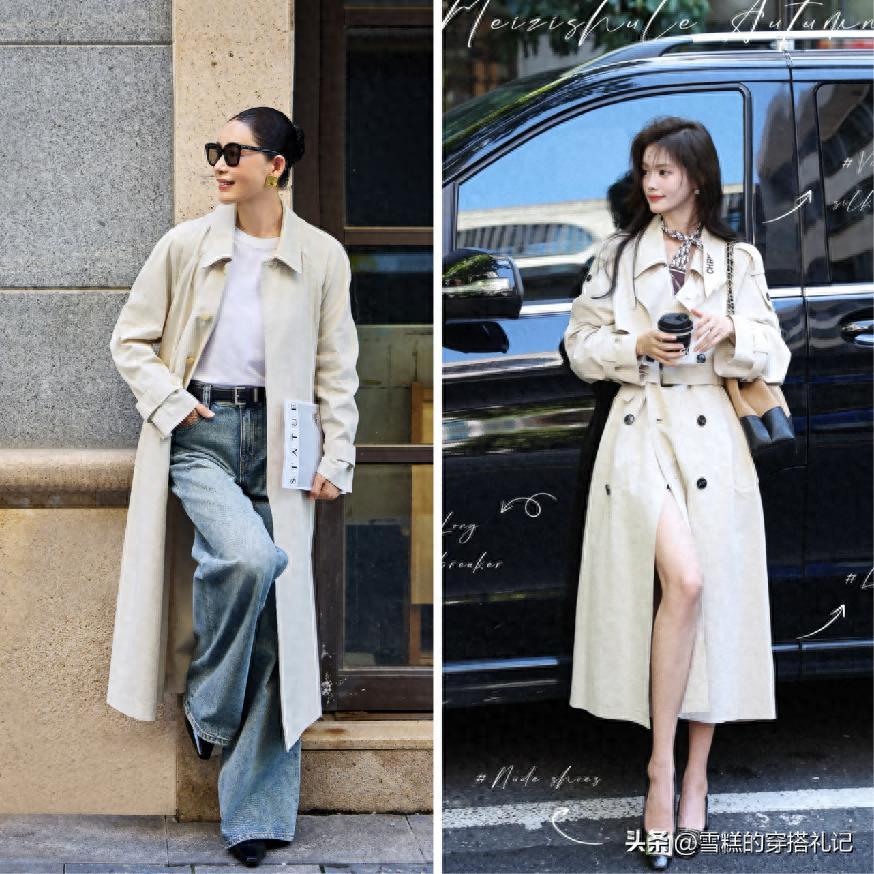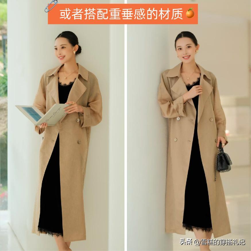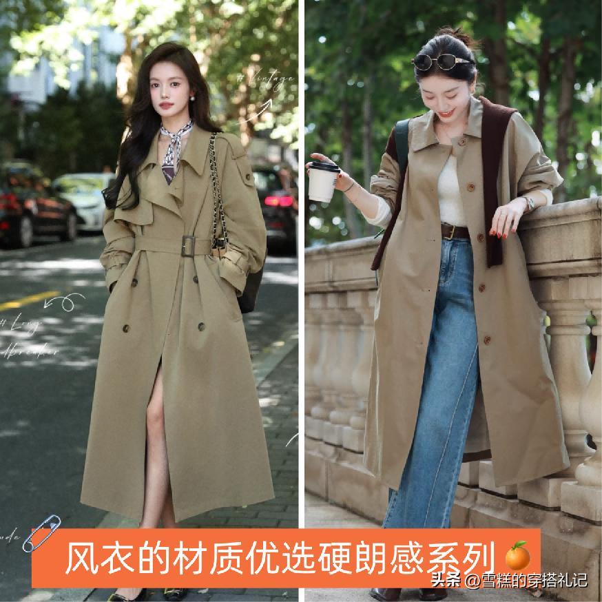 如果你所搭配風衣效果會想要更加體現利落感誘人的氣質效應,那麼我們在選擇材質的時候就可以首選運用垂感較重的一些類型,搭配起來的時候襯托出來的輪廓感有着很明顯被拉長拉伸、垂地的這樣一種感覺,不用擔心線條不好看或者是輪廓不穩定的現象。