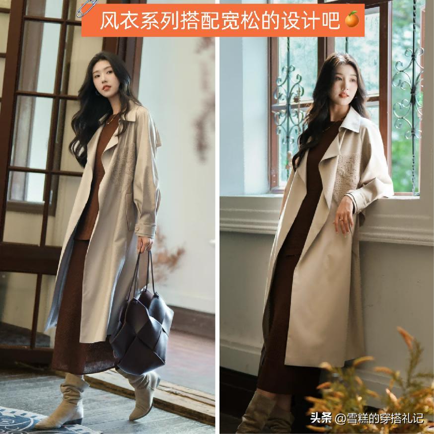 當下正值秋季的階段當中最經典的色系當然就是美拉德了,而且大地色當中的很多經典的顏色,對於我們肌膚狀態或者是最終所呈現出來的身形穩定度是很高的。那麼首當其衝的當然就是像卡其色風衣或者是棕色以及褐色這樣的元素是最爲適宜的,也建議屏幕前的各位女性可以將其作爲首選。