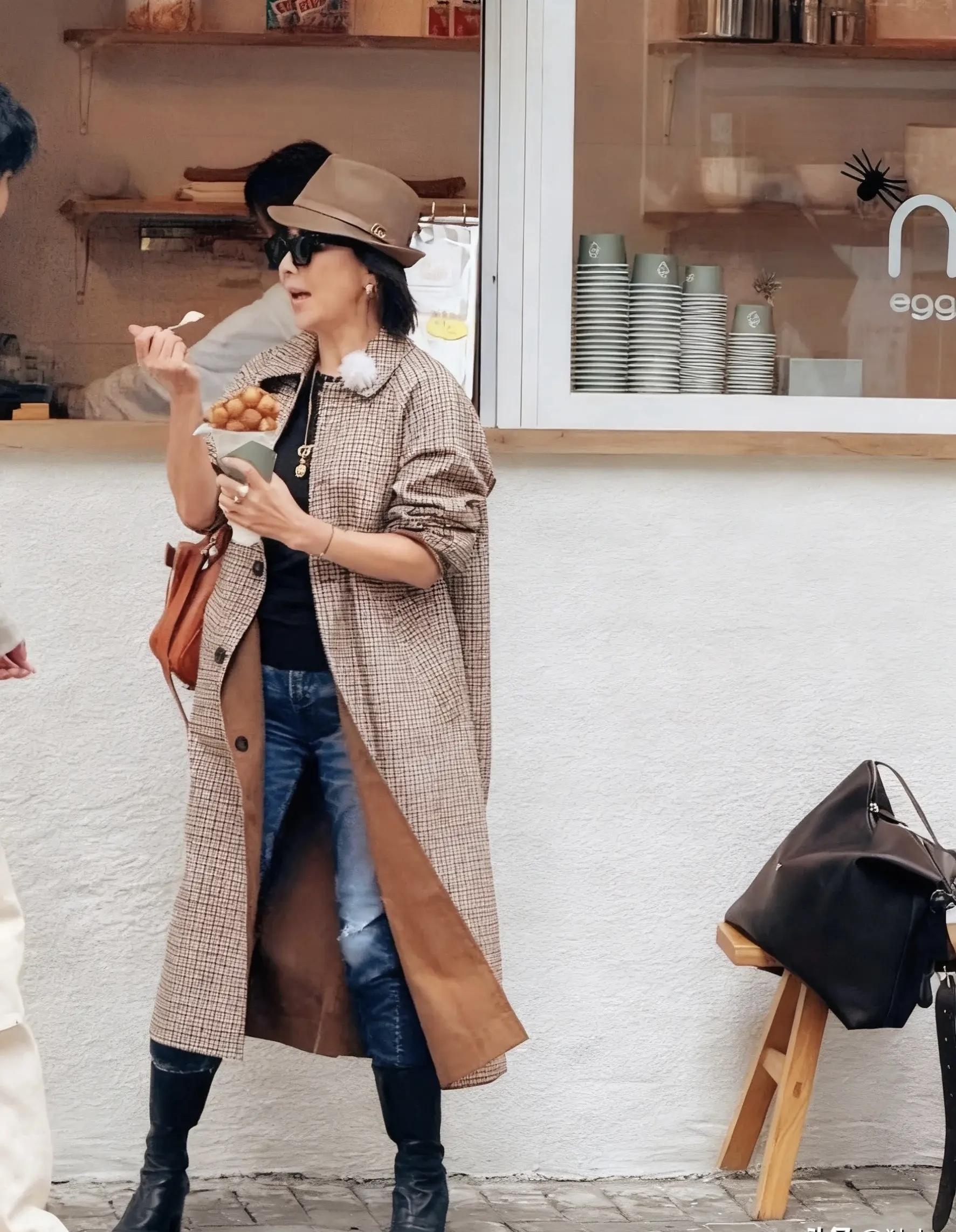劉嘉玲穿了一件棕色千鳥格的風衣,配了同色系的小禮帽、棕色的揹包,就連耳環都那麼素雅別緻,整個是老錢風的貴氣穿搭。
