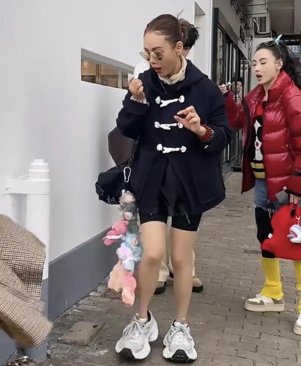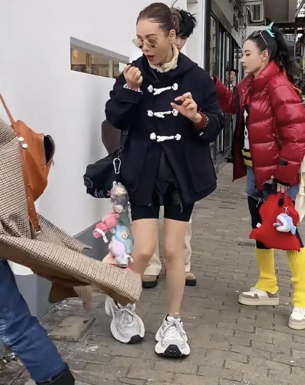 寧靜上身穿着一件牛角扣的短外套,下身配了瑜伽短褲,有一種學生妹的既視感。還在包包上掛了一大串的labubu,真是太有童趣了。