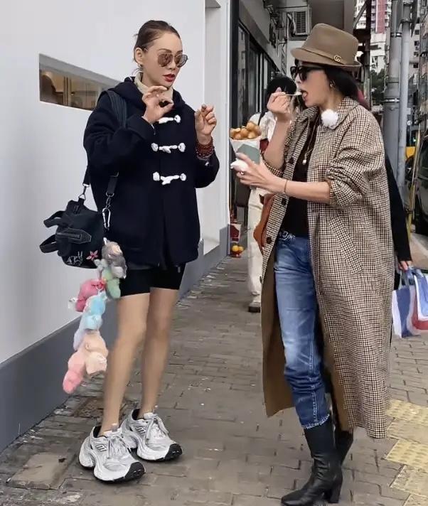 張柏芝和寧靜合影的時候,倆人雖然都穿着短褲,但寧靜直接光腿、看着就瑟瑟發抖。而且張柏芝打底褲+堆堆襪+牛仔短褲,像是裹了三層的麪包圈,瞬間回到千禧年代。
