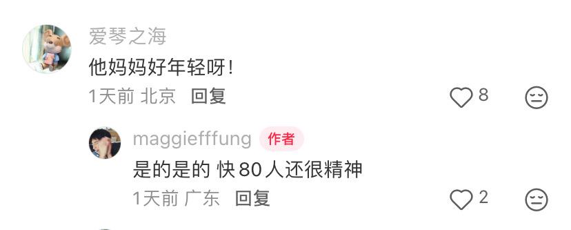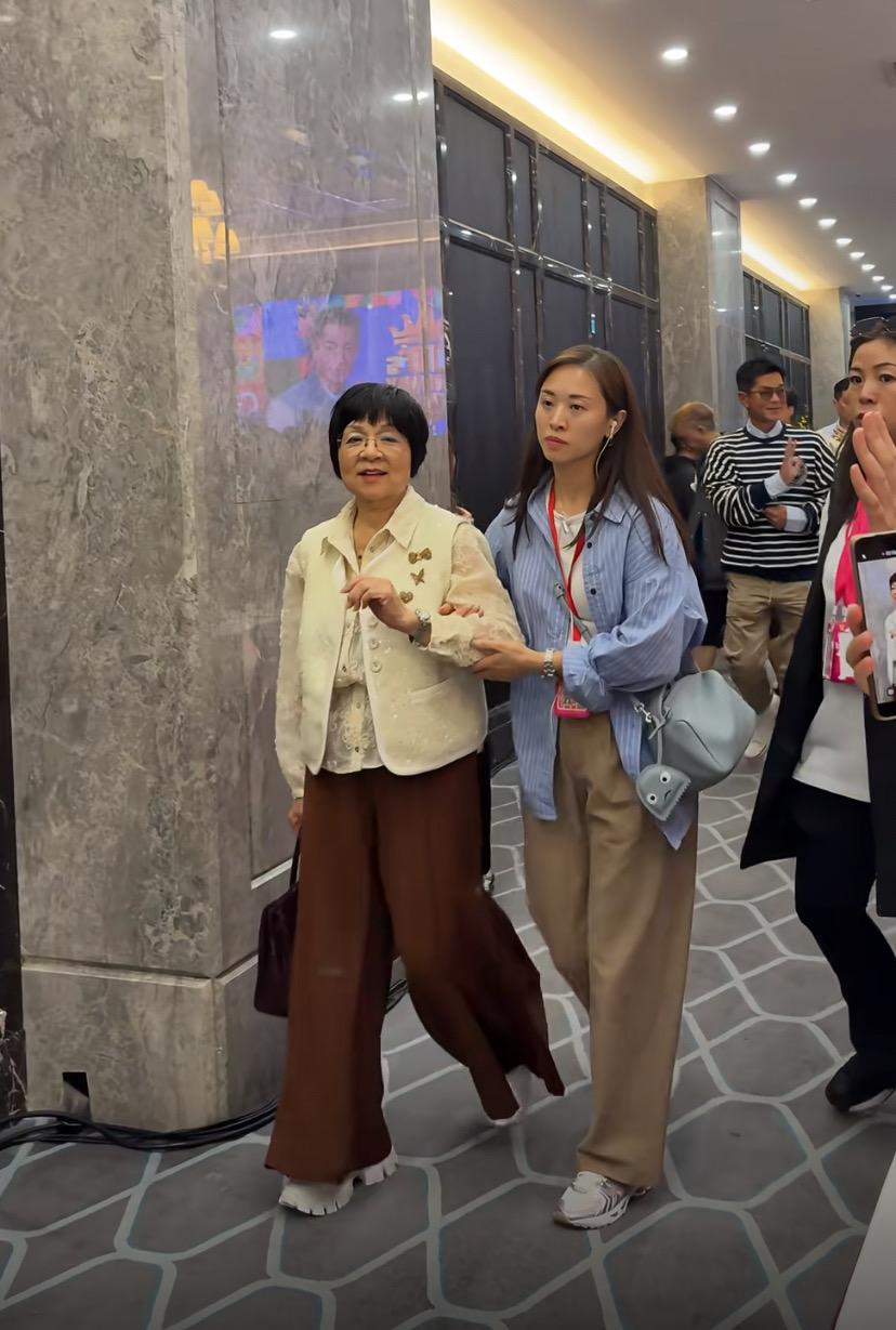 古媽媽都八十歲了,在助理的攙扶下入場,她看着很年輕。留利落的短髮、穿白襯衫+小香風馬甲,精緻又貴氣。一點沒有彎腰駝背,精神頭很好。