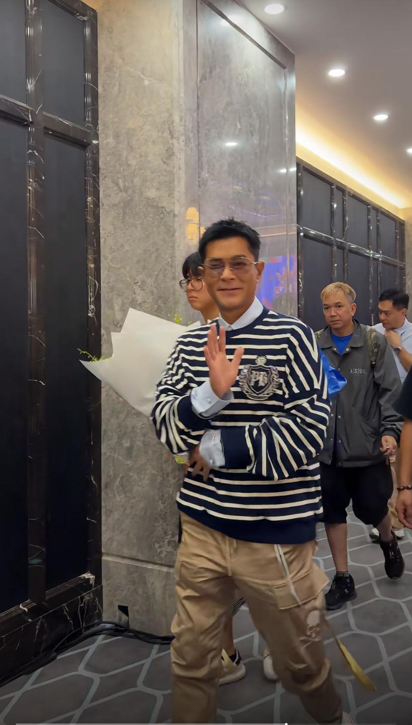 在古天樂身後跟着很多工作人員、助理,因爲這場生日宴是和家人、朋友、粉絲一起慶祝,所以安排的比較充分。