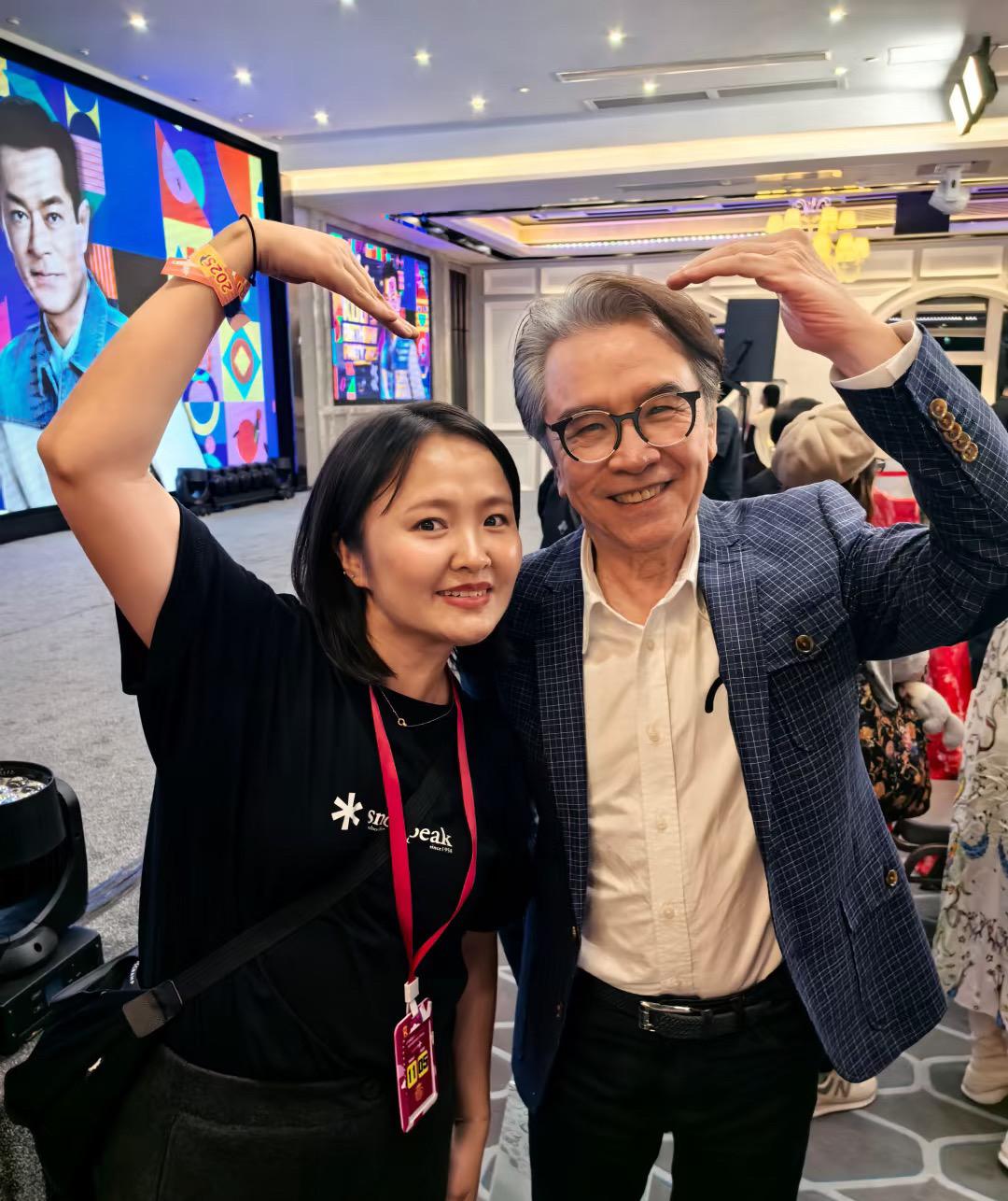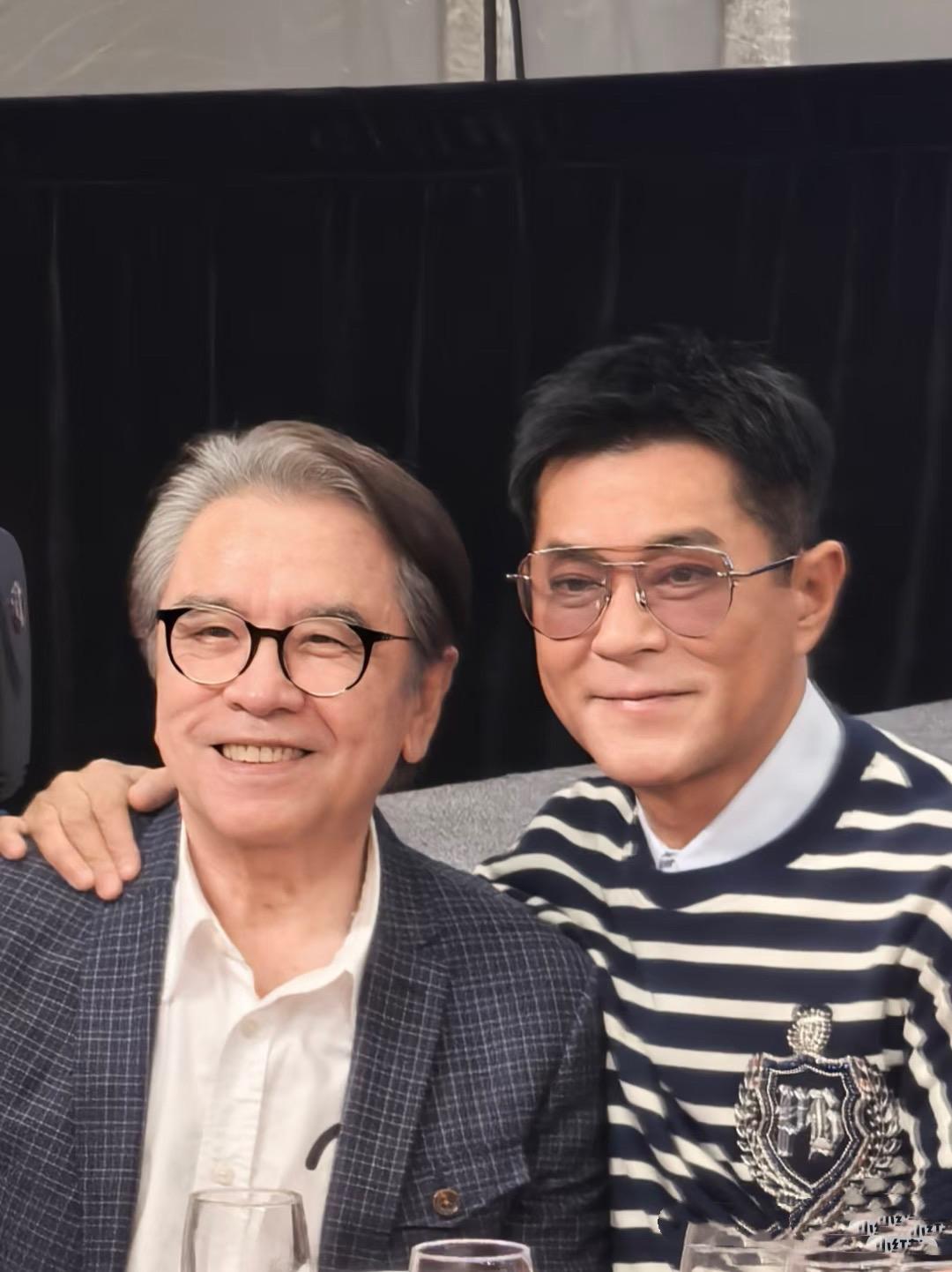 78歲的姜大衛帶着太太李琳來了,他鬢角的頭髮都白了看着還很精神。古天樂摟着他的肩膀拍照,兩個人看起來感情也不錯。
