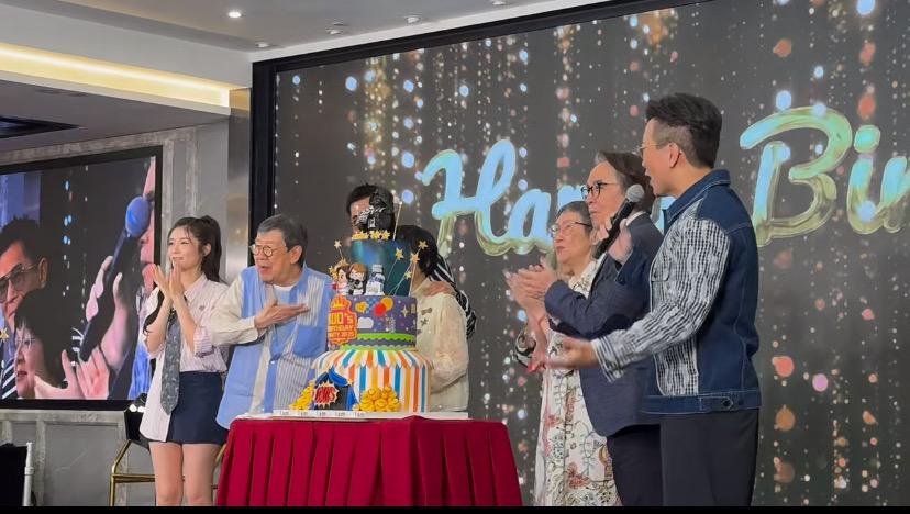蛋糕印有Q版機師造型的古天樂通行證,還有小朋友們表演跳舞。古媽媽、前經理人芭姐、胡楓姜大衛李琳琳都上臺一起切蛋糕了。