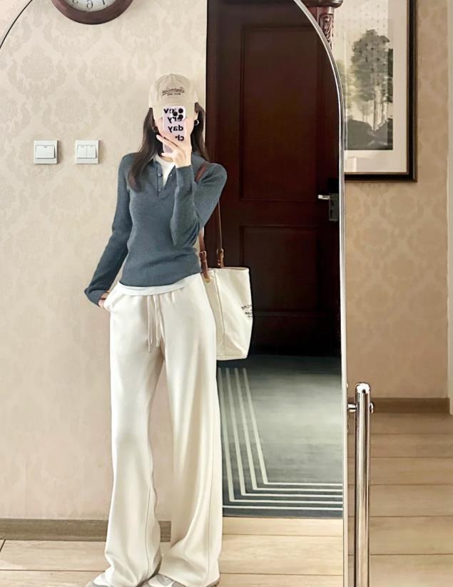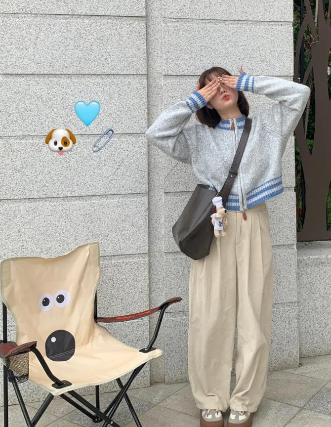 這一套穿搭看起來也太減齡了,日系風滿滿,淺灰色藍邊針織開衫,清新又顯活力,下面配的米白色闊腿褲,爲整個穿搭營造出慵懶範,搭配一雙拼色的德訓鞋,增添了幾分休閒氣息,深灰色挎包,逛街這麼一套很方便,少女感十足的造型。