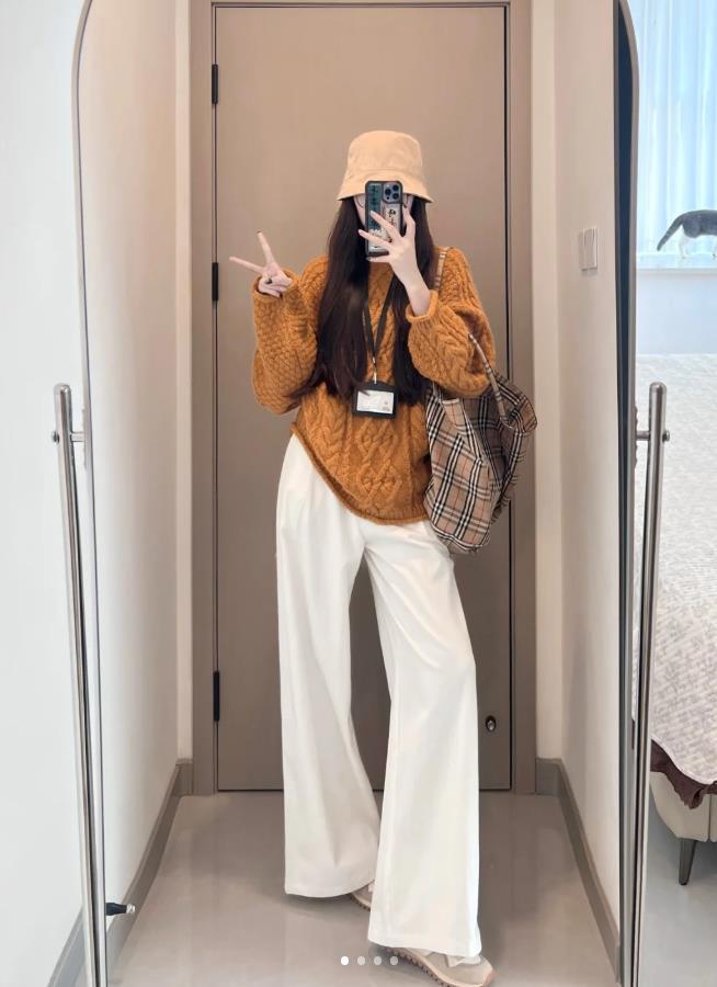 暖橙色的麻花針織毛衣,這個色調也太襯膚色了吧,下面搭配一條白色闊腿褲,寬鬆的版型能很好營造出鬆弛感,腳上配上一雙厚底的德訓鞋,整個風格溫暖又休閒。