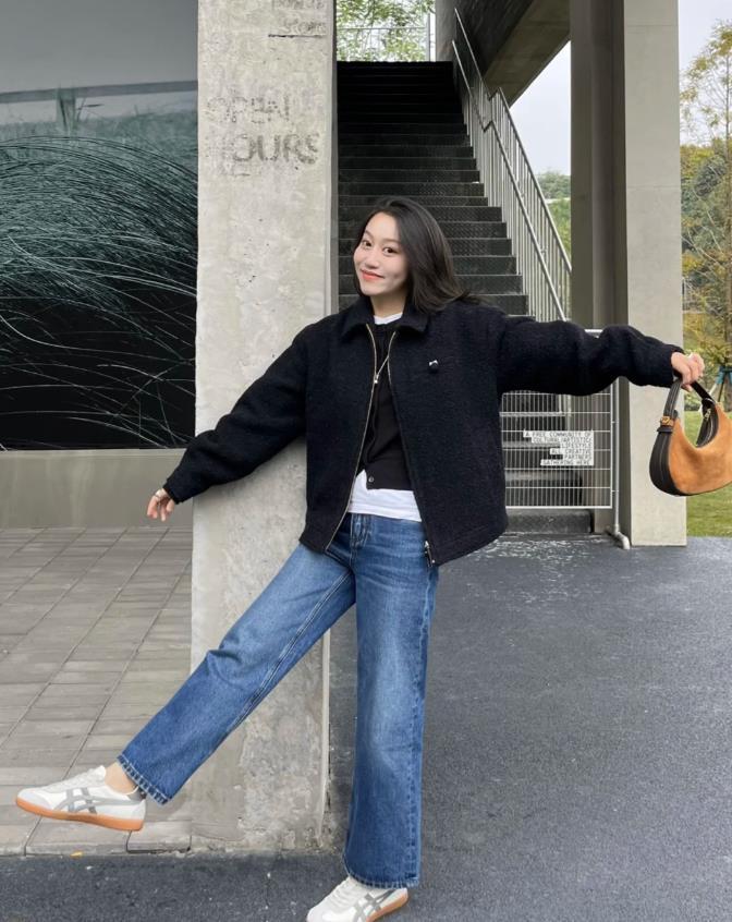 黑色羊羔毛短外套,穿起來可顯溫暖了,內搭黑色開衫+白色t恤,輕鬆打造出層次感,下身是一條藍色牛仔闊腿褲,不僅能很好遮掩住腿粗的缺點,還顯得有些隨性,腳上踩着一雙灰白拼色的運動鞋,整個風格充滿了休閒與活力。