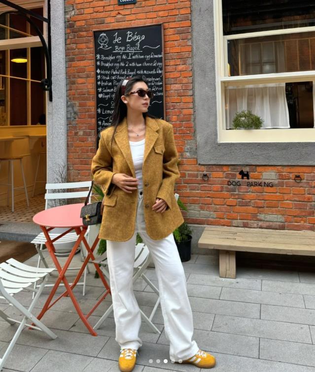 滿滿復古風的一套搭配,喜歡這種風格的真的可以借鑑起來,暖黃色的西裝外套,版型是大一號的,這樣的西裝外套穿起來並不會顯得太嚴謹,內搭白色簡約背心,下身搭配白色闊腿褲,寬鬆的版型可顯隨性自在了,腳上踩着的黃色德訓鞋,與外套顏色進行了呼應,輕鬆增添活力氣息。