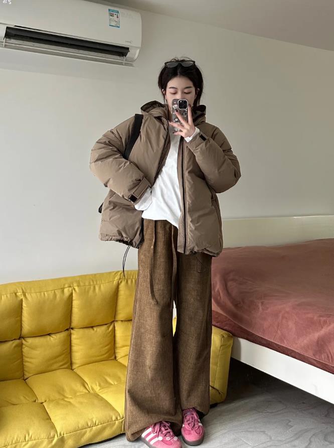 寒冷的冬天,就這麼穿着出街吧,保暖時尚,卡其色短款羽絨服,可太適合個矮的身材了,內搭白色基礎t恤,下身是一條深棕色闊腿褲,寬鬆的褲型穿得很顯隨性,腳上踩着一雙粉色條紋運動鞋,輕鬆爲整個穿搭增加了活力氣息,再配上墨鏡、黑色揹包,增加了細節感,又時尚。