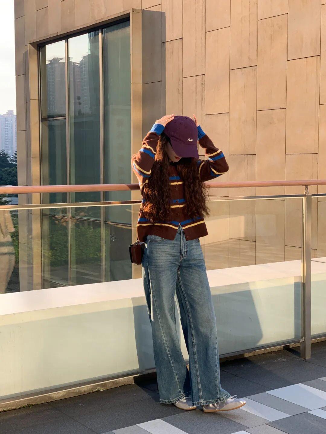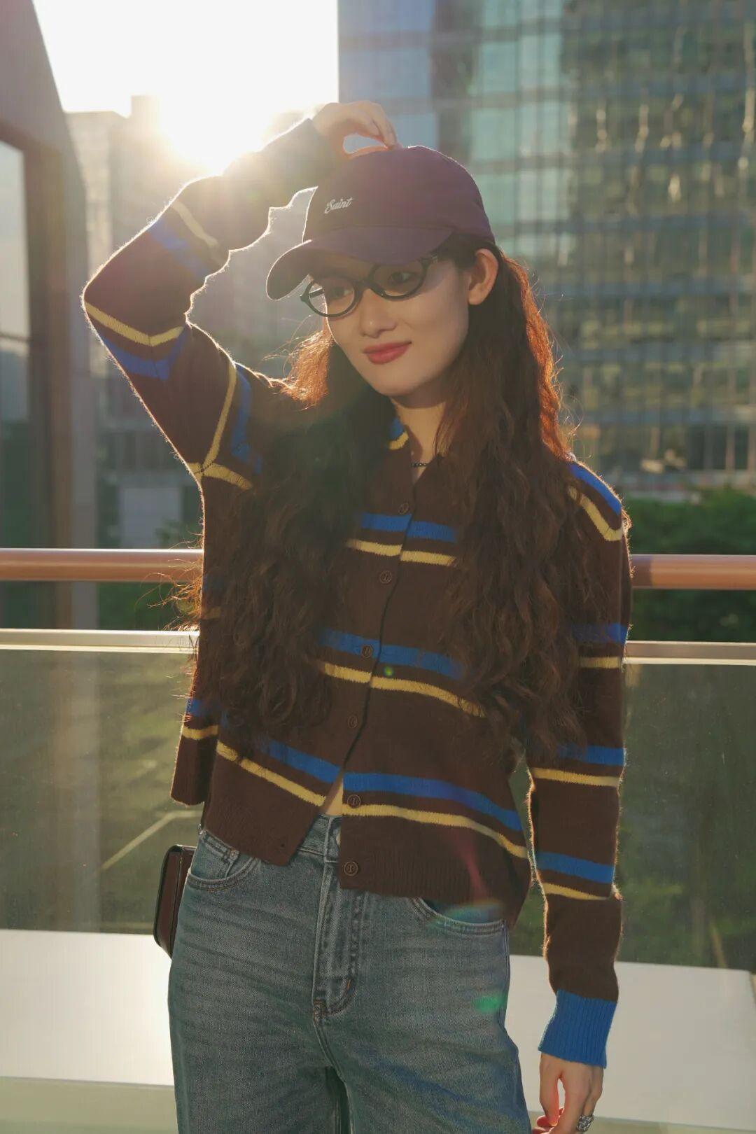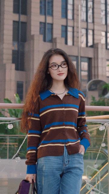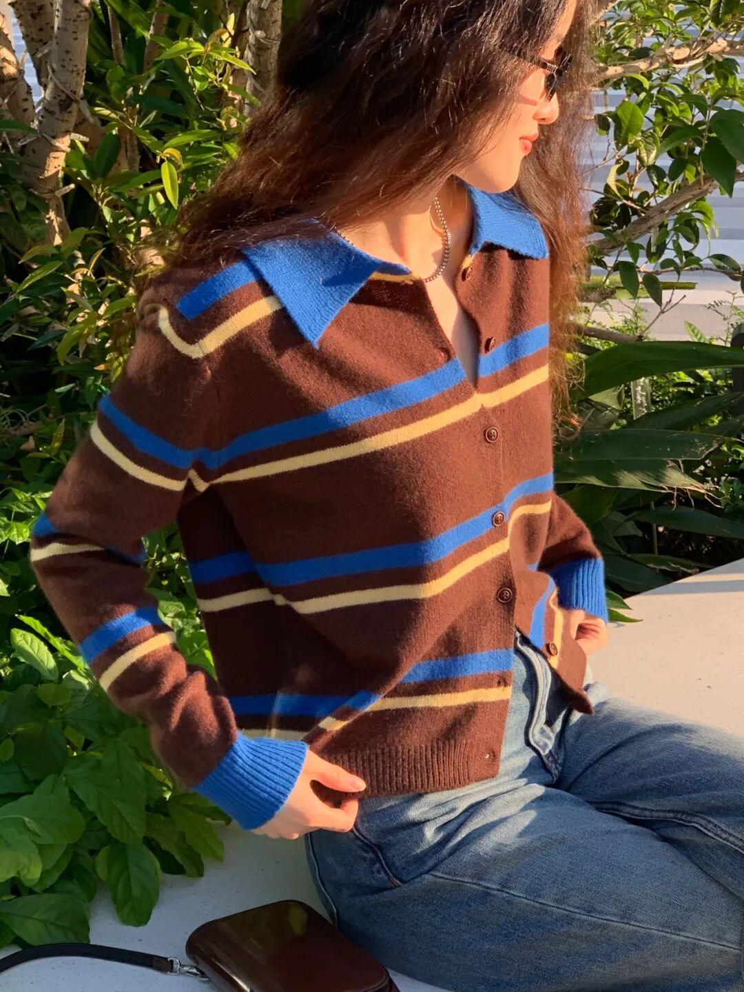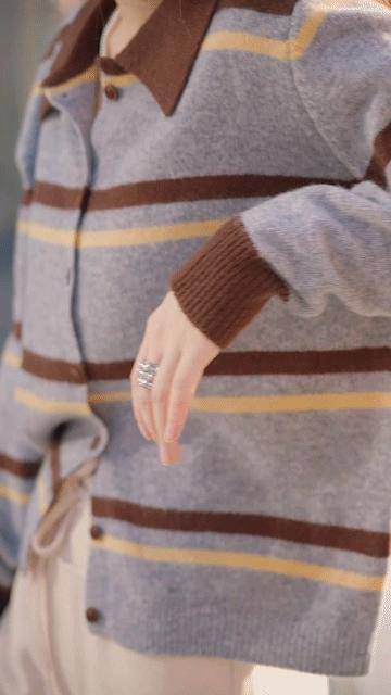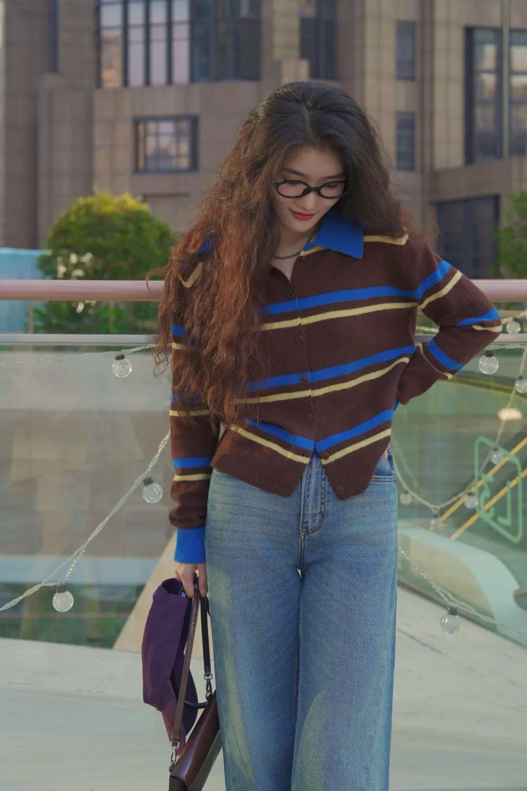 棕藍黃條紋,顏色看似濃郁但一點也不沉悶。告訴你們哦,這個藍色我們對比過色卡,選的是超顯白的藏藍調!日常配一條簡單的牛仔褲都很出衆了。