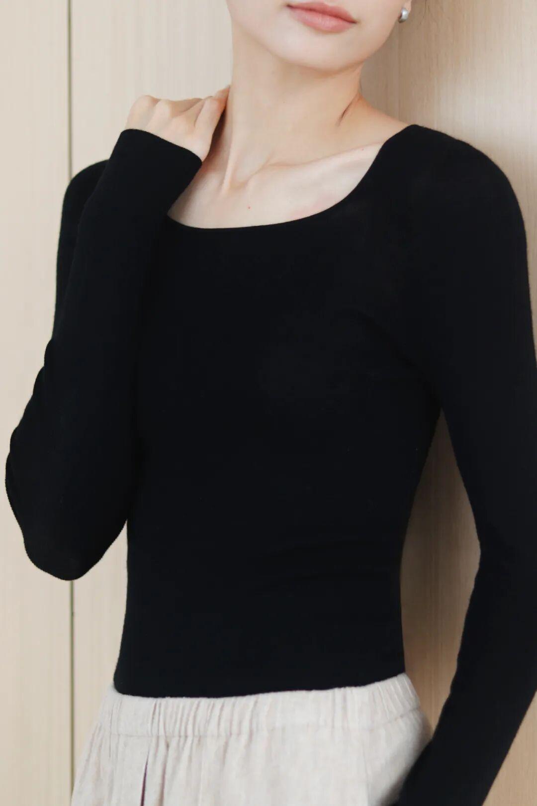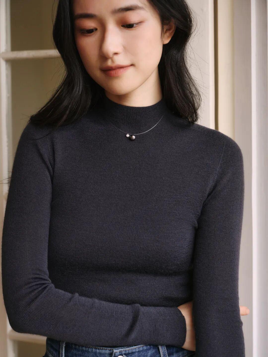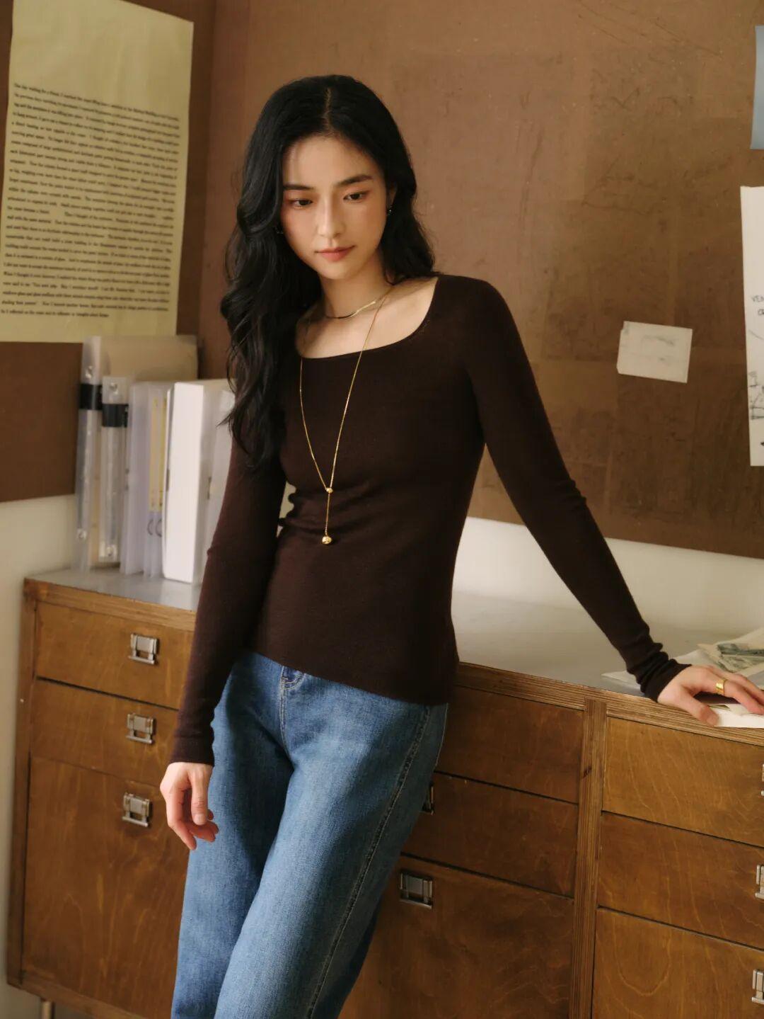 如果你不喜歡有領的,我們還出了一款方領的打底衫,用的也是揚子美麗諾羊毛,但是支數更高,足足有60支!