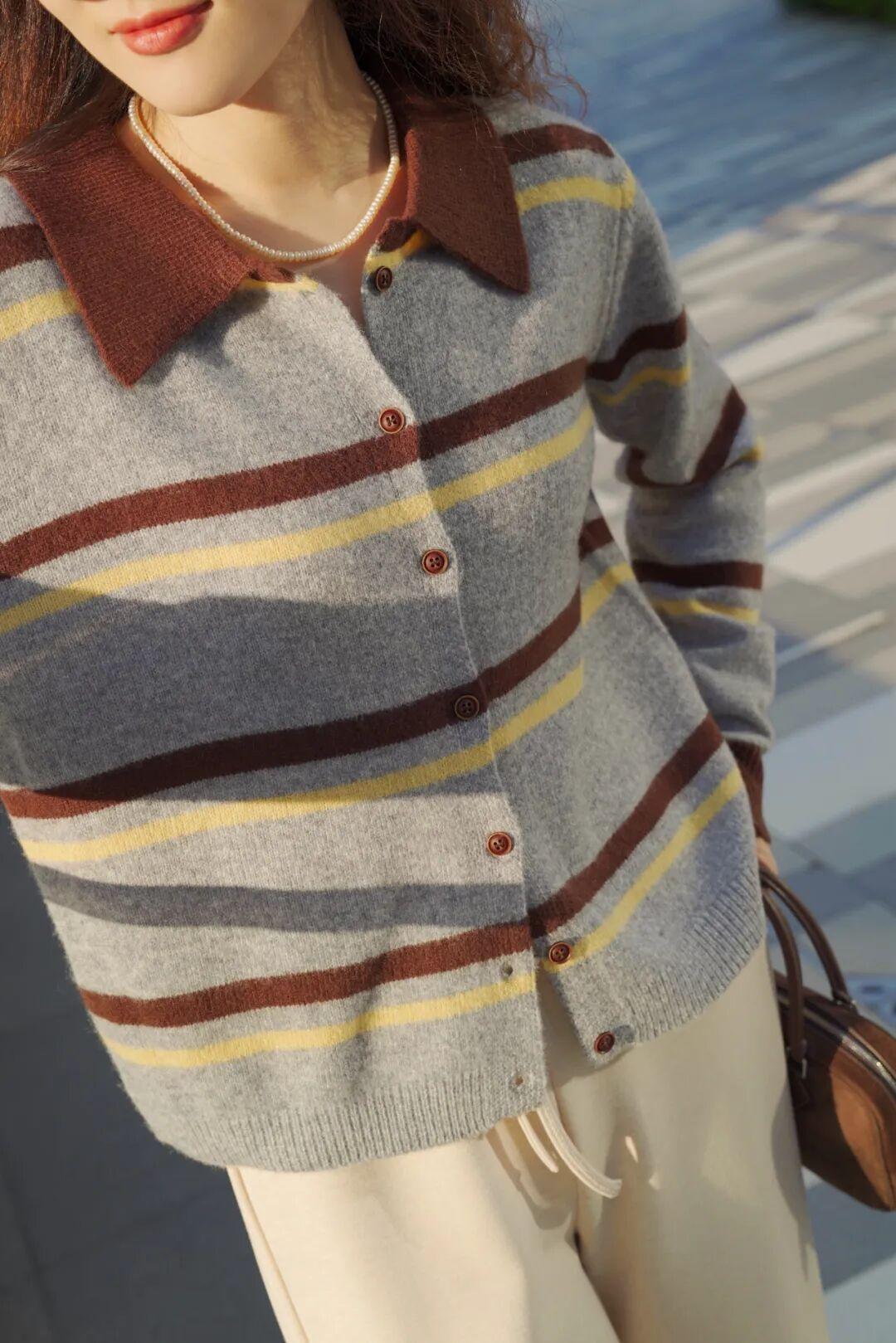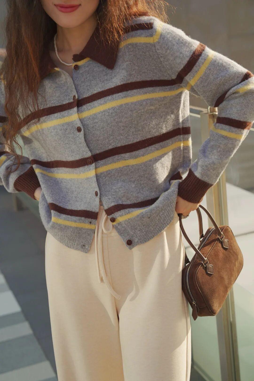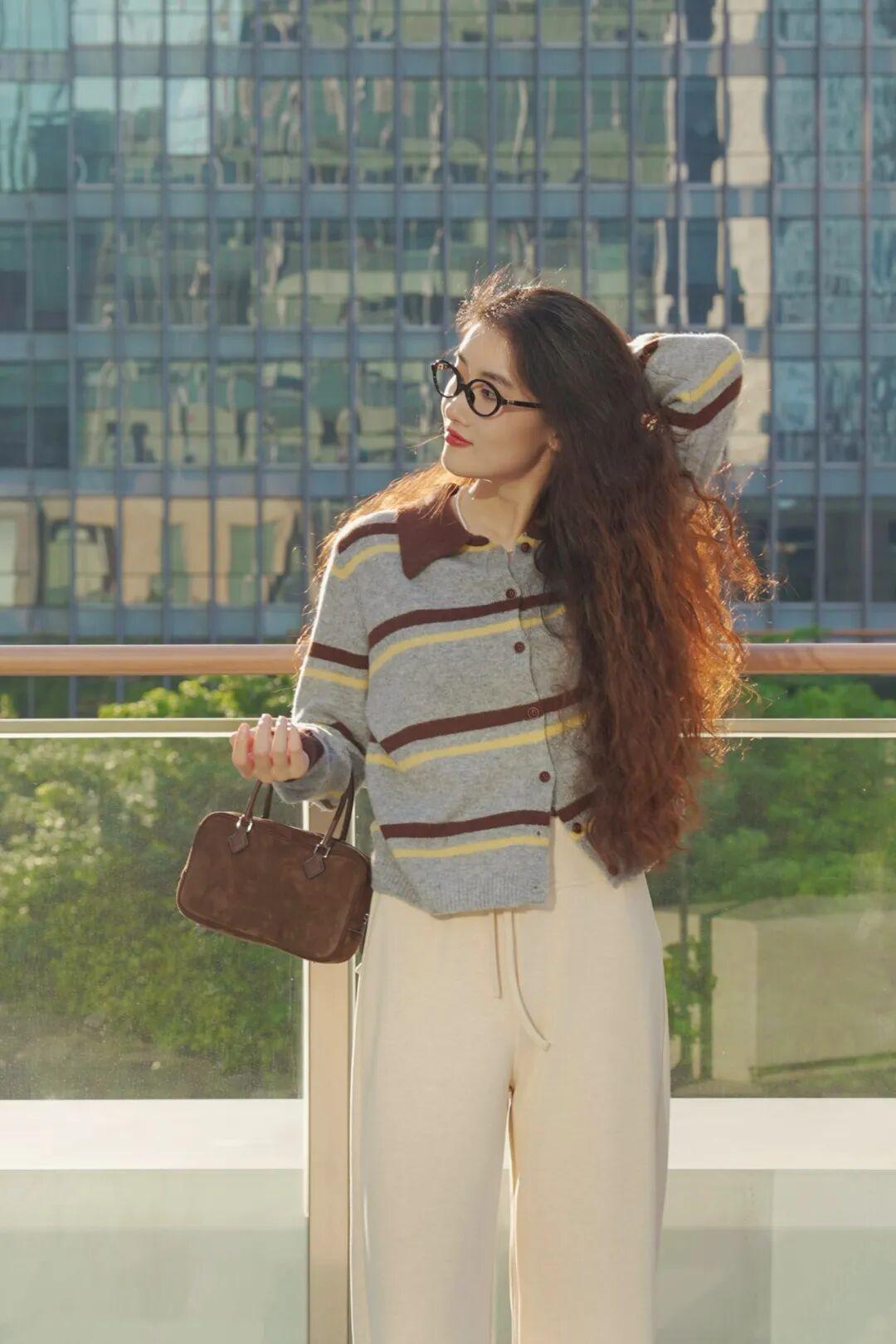 灰棕黃條紋自帶一種朦朧美感,不挑膚色,小面積的黃色&咖啡棕,很別緻地把秋意糅合到衣服裏,配淺色的下裝有種復古文藝的氛圍。 ▼