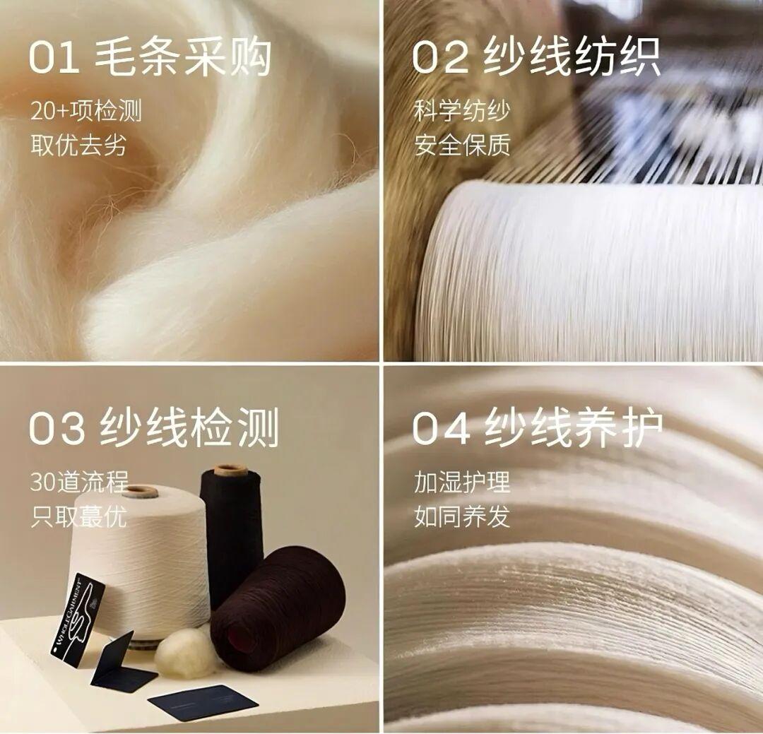 首先在毛條的採購上就非常嚴苛, 只精選頂級的美麗諾羊毛,還要經過20+項檢測、30多道流程,只取最優的紗線,才能成爲真正的揚子紗。 ▼