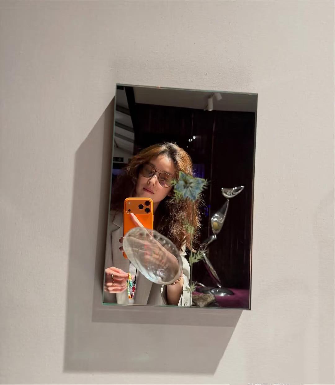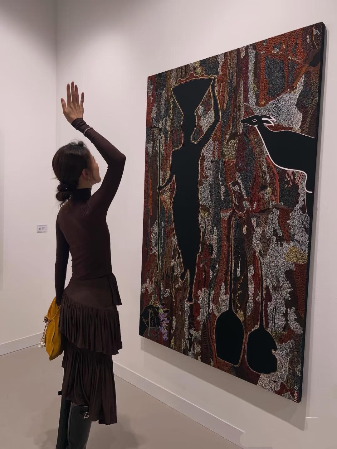 章澤天很喜歡這次的藝術展,她對着牆上的展品擺出相似的pose,這個角度好美呀。原來練體操的女生,身材和體態這麼棒,輕盈又柔韌。