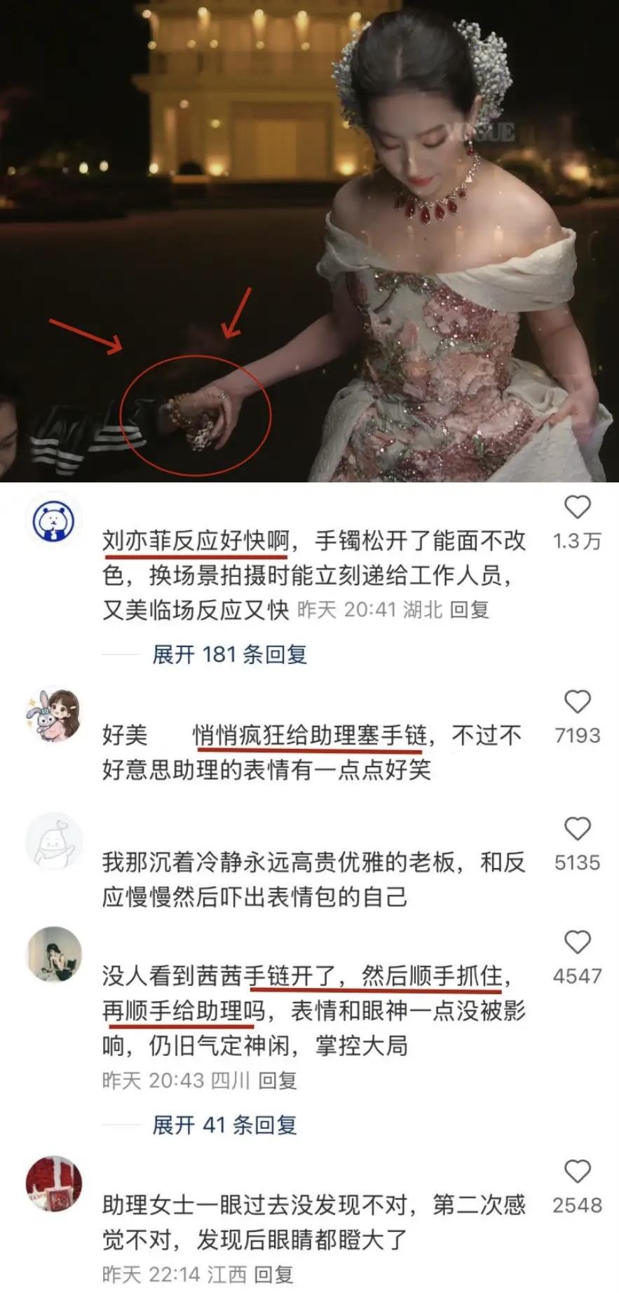 不少網友都注意到了這個細節,手鐲鬆開了還能面不改色、等着換場拍攝的時候立刻遞給工作人員,這臨場反應棒極了。