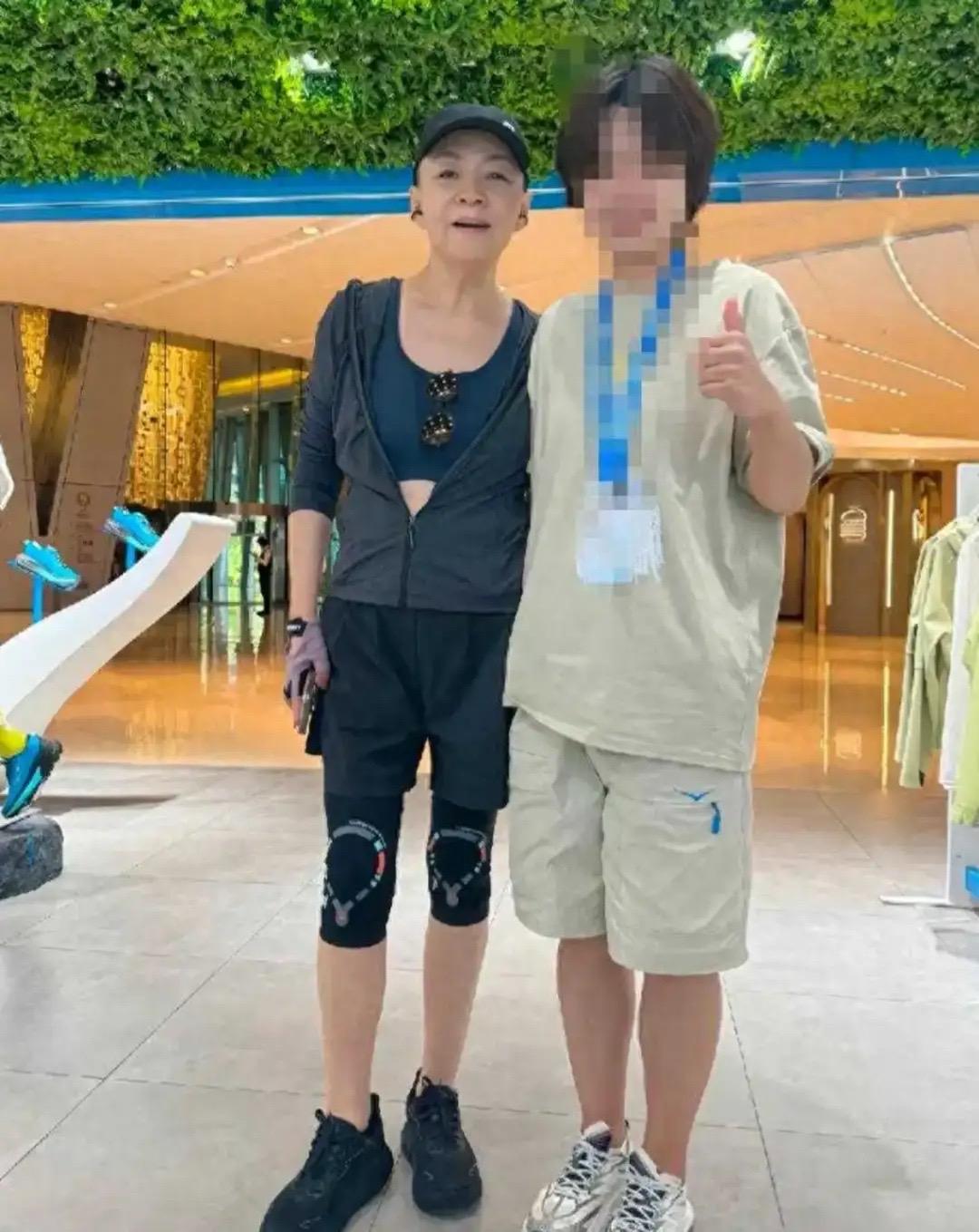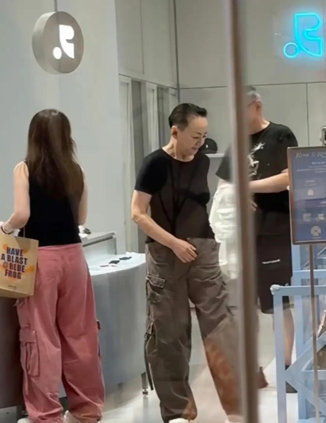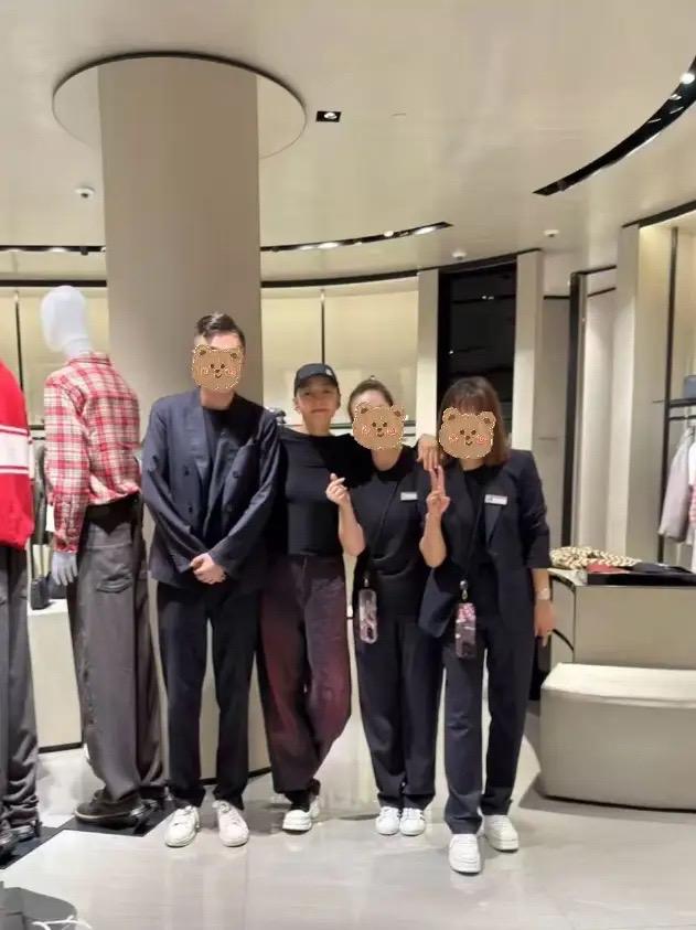 她和店員們合影的時候,自然的把手搭在美女小姐姐的肩膀上。看起來身材很苗條,這體態比年輕人都優越。
