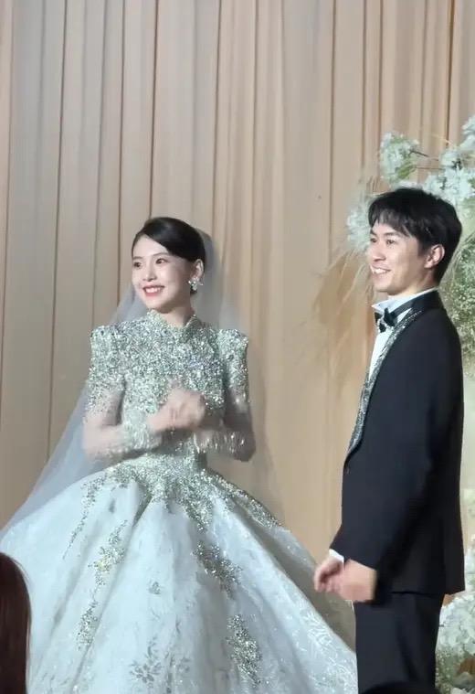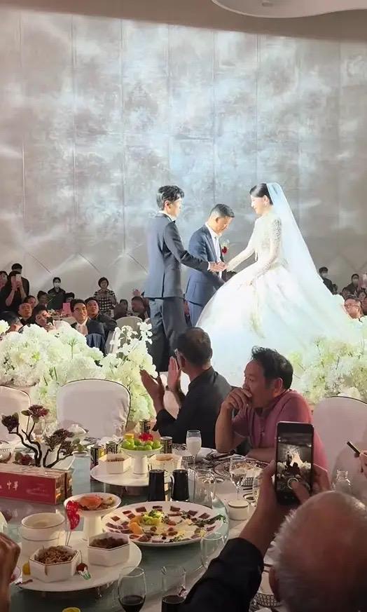 新娘打扮的很漂亮,穿着蕾絲鑲鑽的婚紗禮服,新郎穿了一身黑色西服配了白襯衫、黑領結。金明龍個子不是很高,已經29歲了,不過家境殷實也是不錯的選擇。