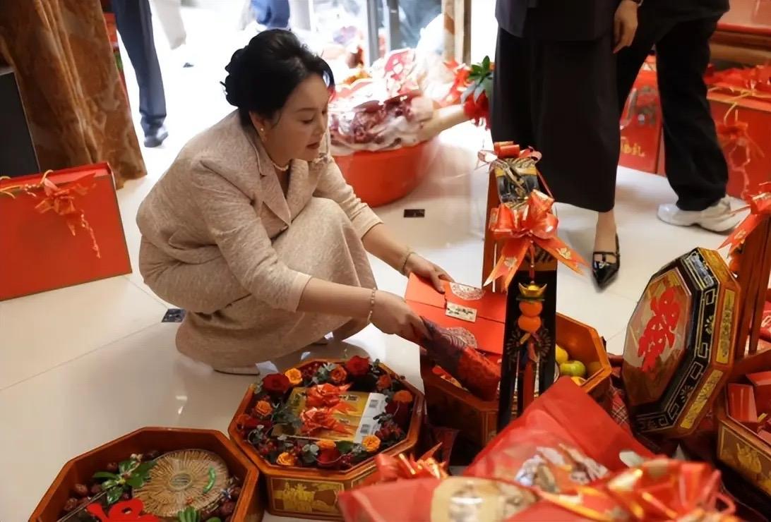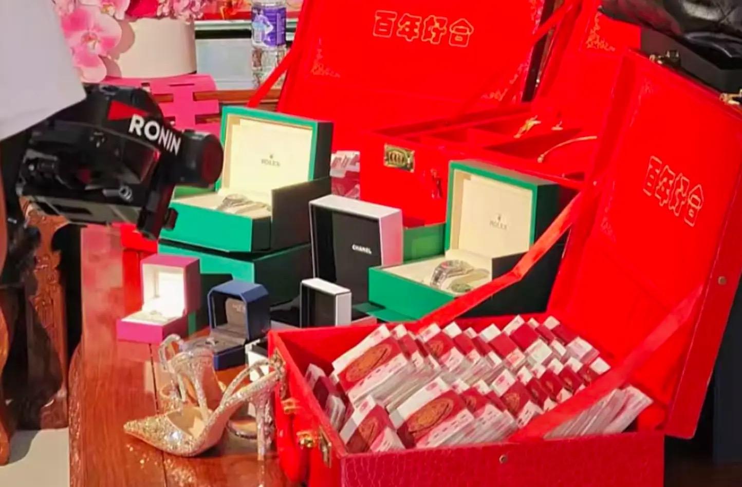 在章芊意的聘禮中,還看到了大半隻豬肉,放在一個大紅色的盆子裏。其他的禮品也都是精緻的紅色禮盒包裝,相當喜慶。