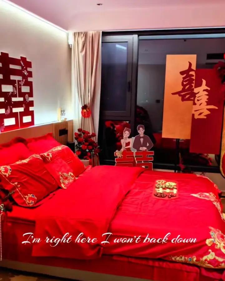 婚房的佈置和普通人家差不多,也是大紅的喜被、大大的喜字,還有兩個人的人像立牌。在牀上擺滿了花生、棗子,寓意着早生貴子。這個習俗,應該是很多地方都一樣的。