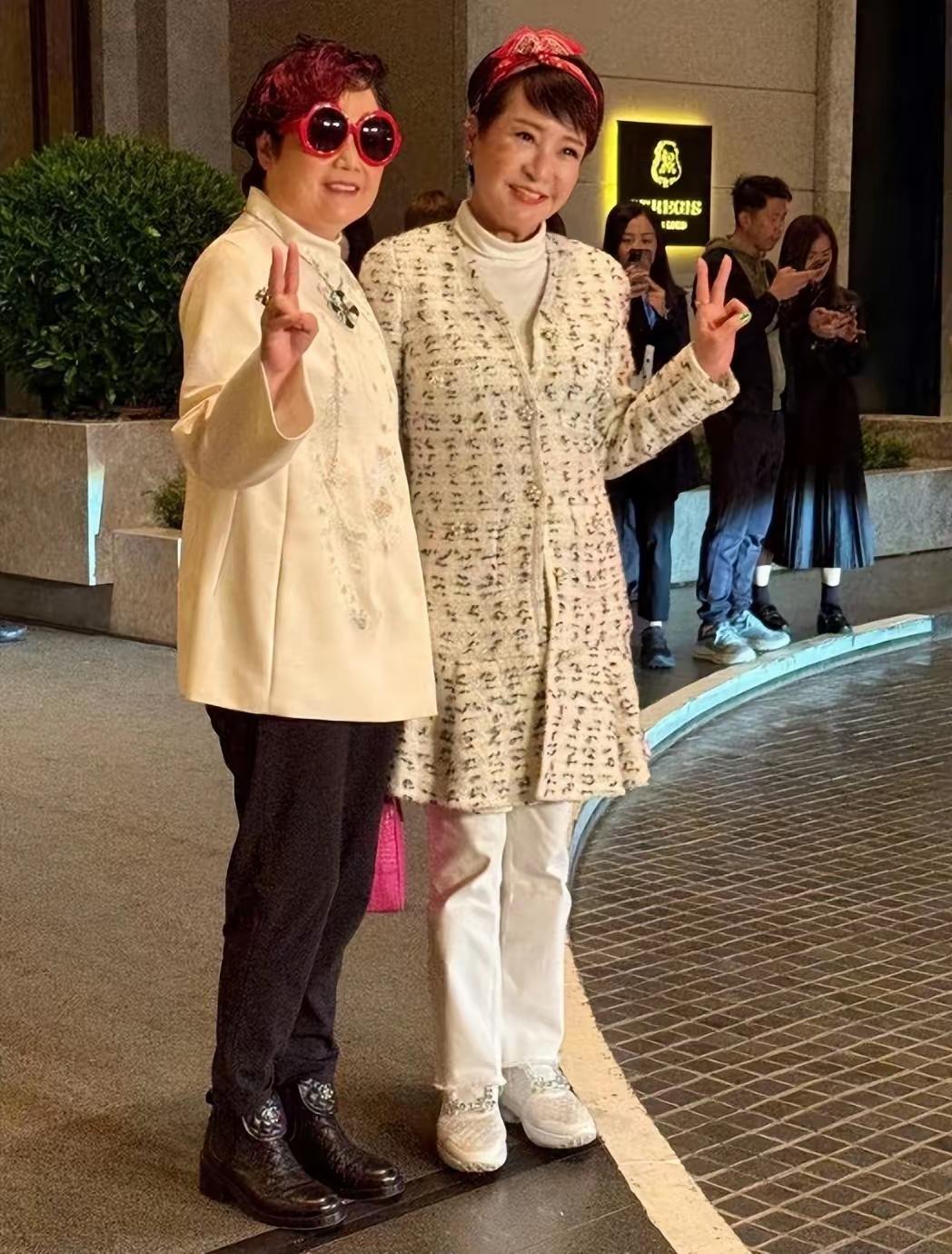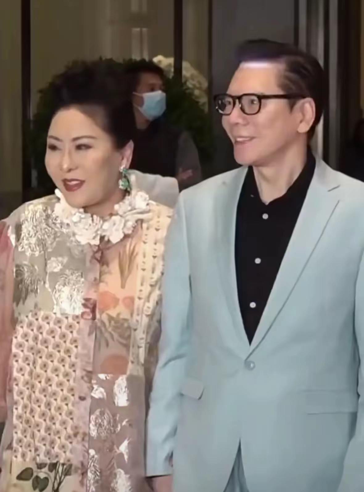 向太打扮的很貴氣,穿着宮廷風的連衣裙,戴着華麗的寶石耳環。向華強還是一如既往的帥氣,淺灰色西裝、黑色襯衫,更顯精神。