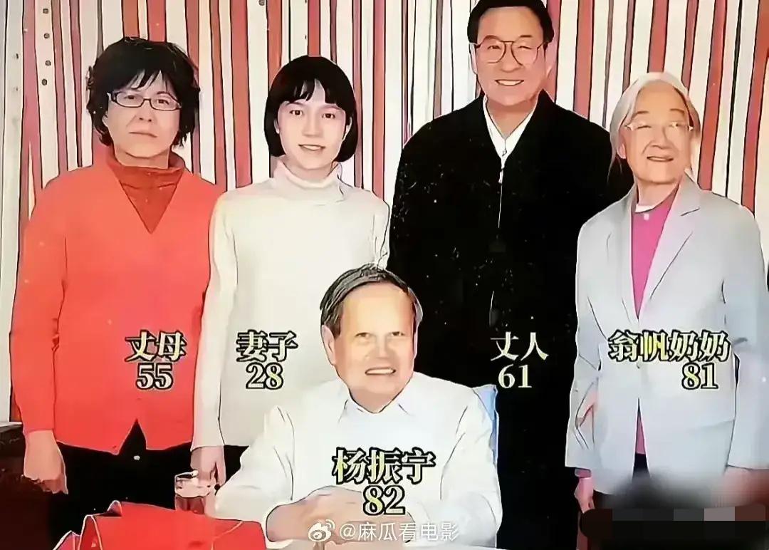 楊振寧和翁帆結婚的時候,已經82歲了。那時候翁帆的奶奶才81歲,比孫女婿還要小一歲。合影的時候,先生坐在前面,翁帆一家人都站在後面。