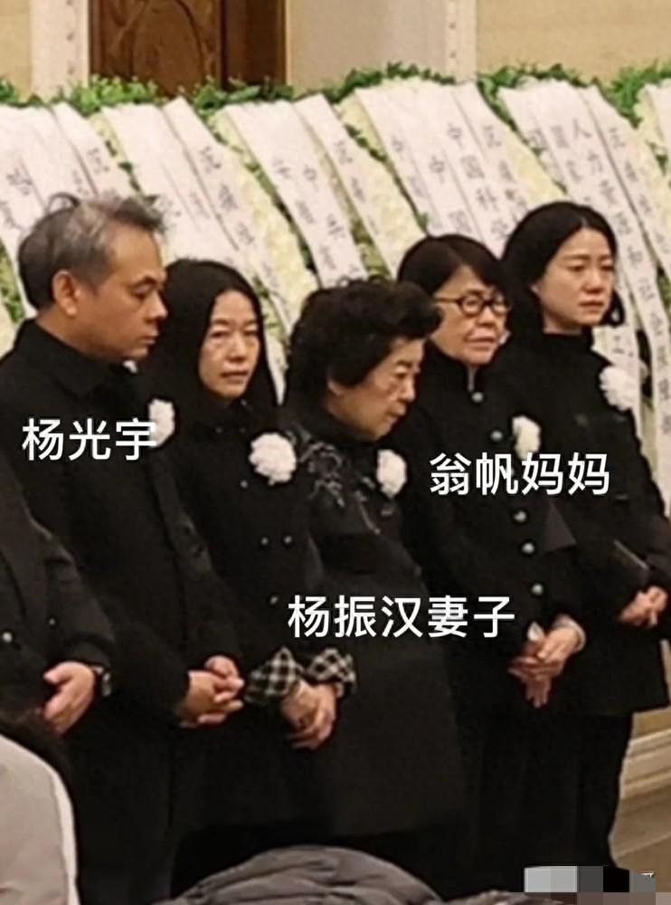 一般而言,葬禮都是平輩或者小輩操持。先生的葬禮,有點不一樣。站在首位的是妻子翁帆、第二位是翁帆的母親石玉鈿,第三位是楊振寧弟弟楊振漢的妻子,緊挨着的是楊廣宇及其妻子。