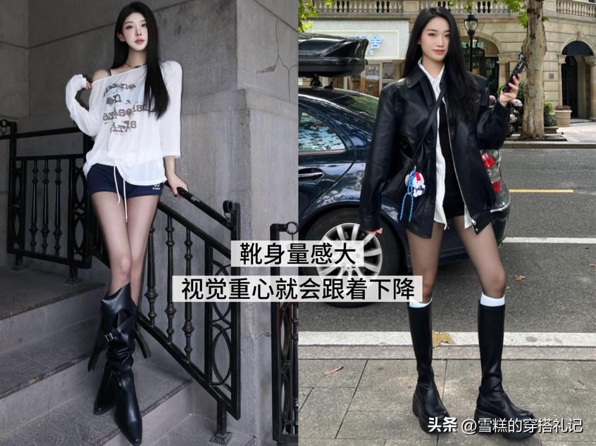 >中長筒靴則適合與短裙或短褲搭配。關鍵在於保證大腿部位有足夠的裸露面積,建議露出大腿部分至少10釐米。足夠的露膚感能夠平衡靴筒的分割效果,保持整體比例的協調。