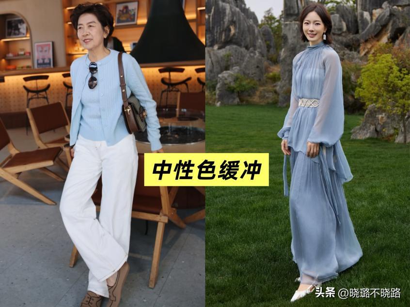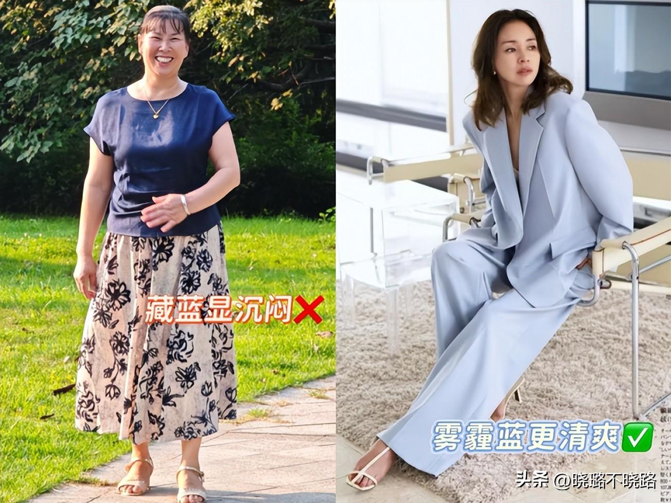 很多中年女性喜歡穿藏藍色,覺得顯穩重,可藏藍色太沉,穿不好容易顯老氣,還會襯得膚色發暗。而霧霾藍是帶了灰調的藍色,像陰天裏的薄霧,清冷又高級,不僅不會壓膚色,反而能襯得黃皮更透亮。霧霾藍還有個好處,就是不挑場合——日常穿顯輕鬆,正式場合穿顯得體,比黑白灰多了幾分記憶點,又不會像高飽和顏色那樣浮誇。