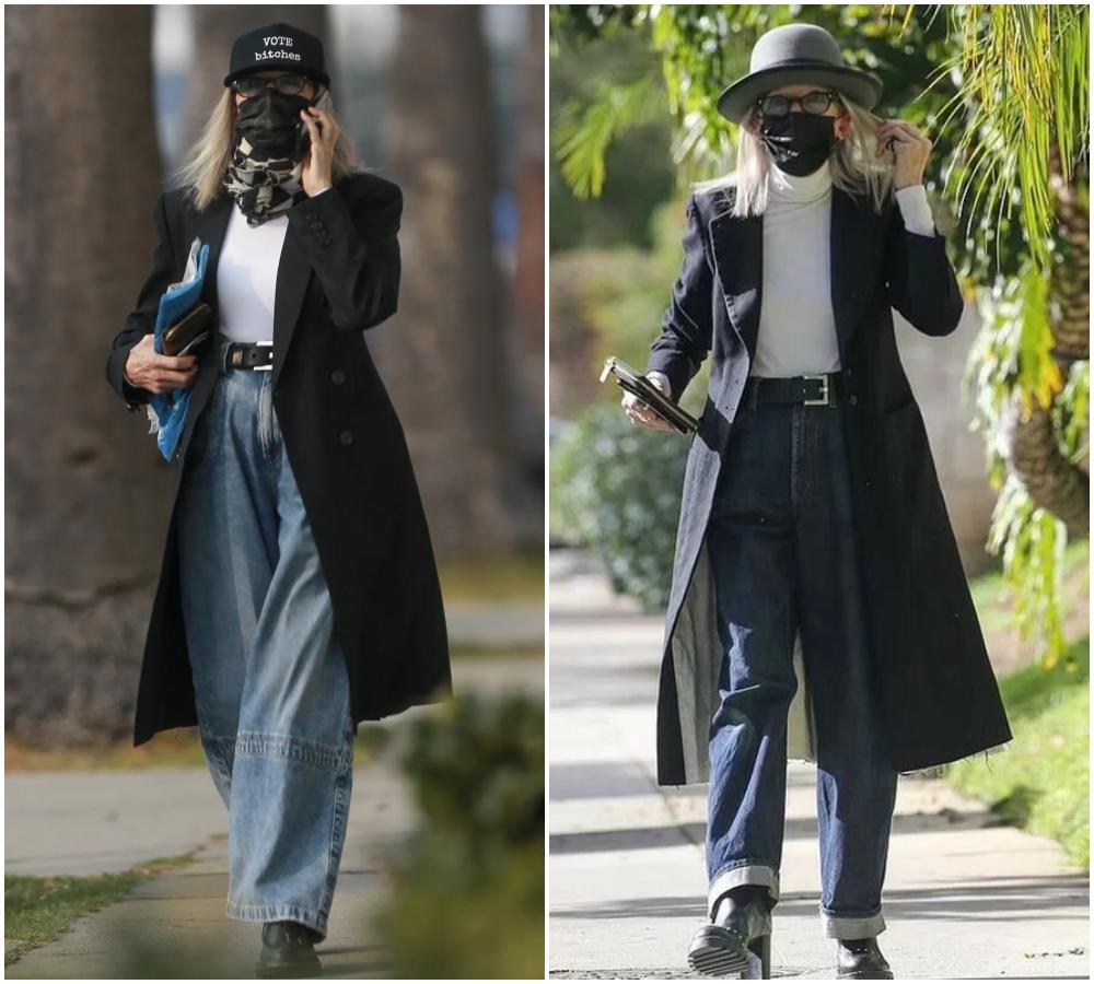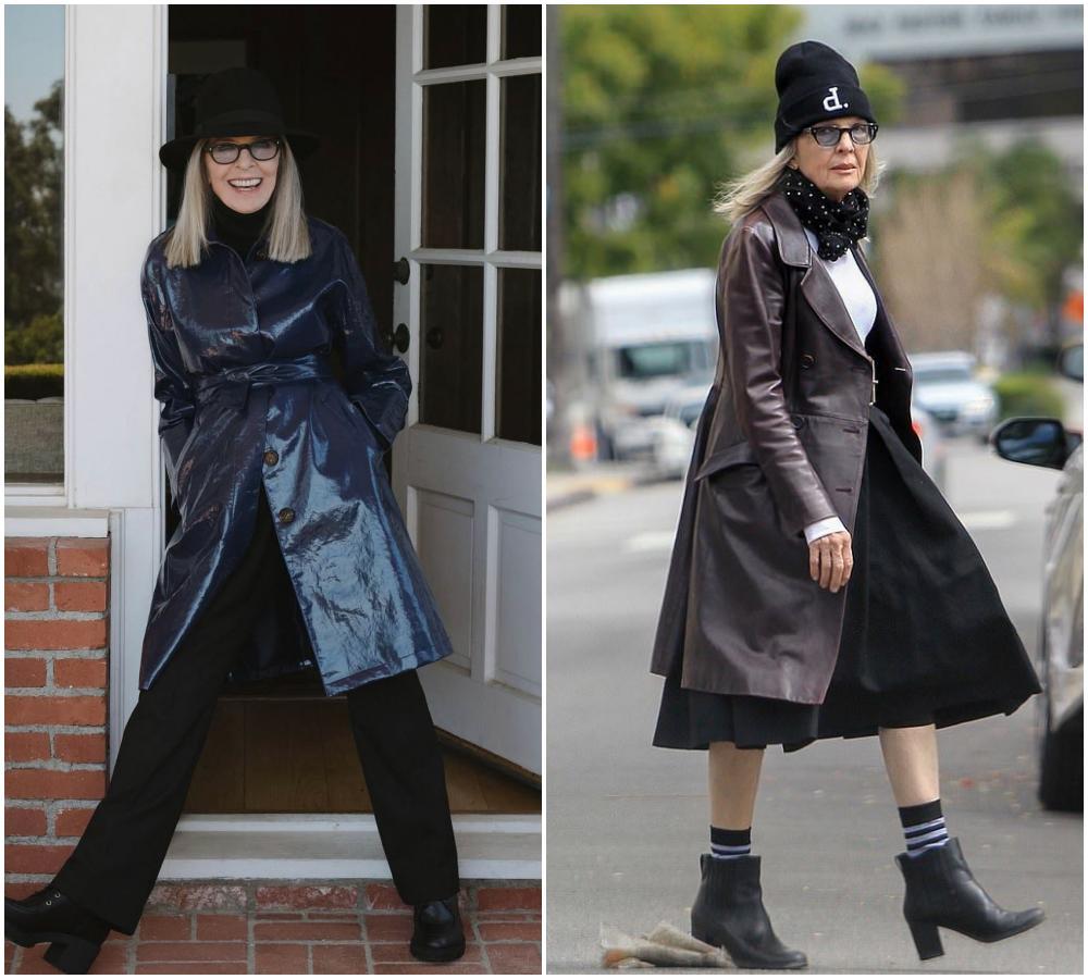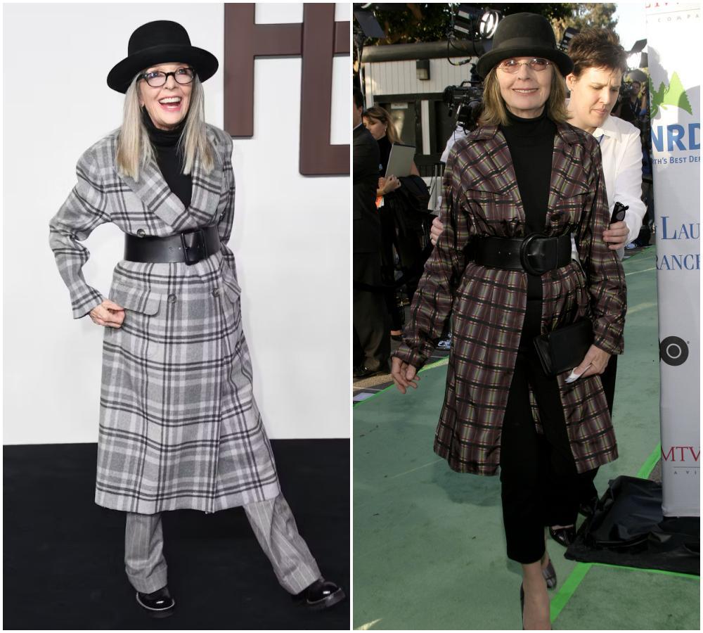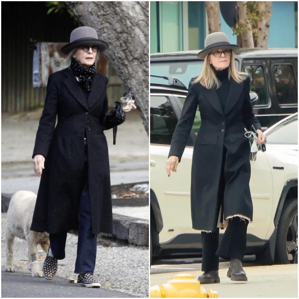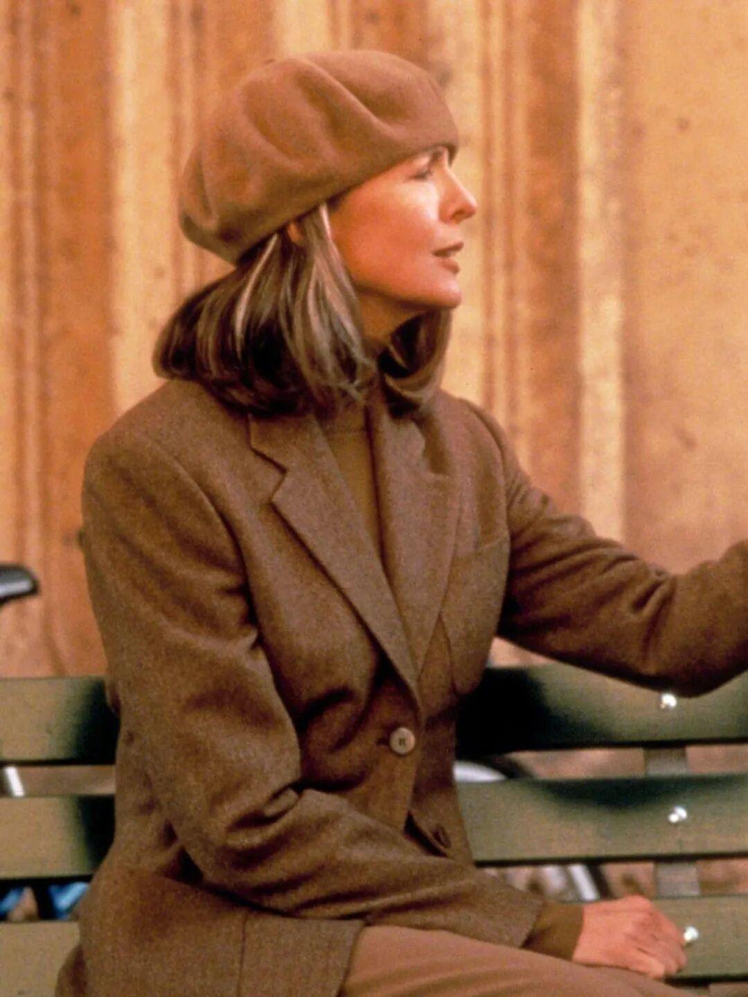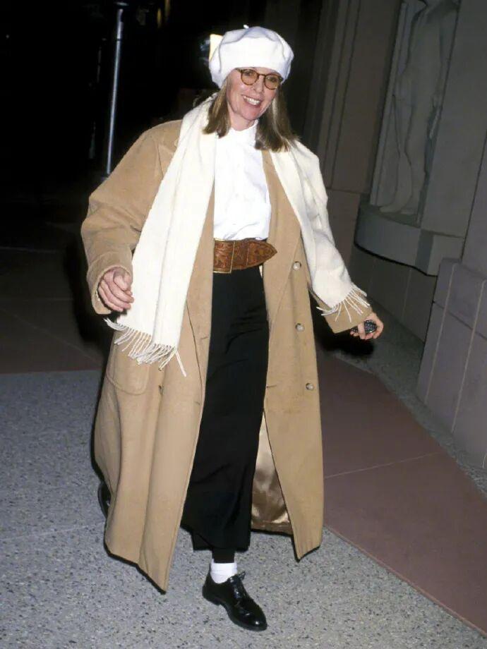 如果說西裝是她的鋒芒,那大衣就是她的分寸。黛安·基頓的大衣,總是鬆弛而氣勢十足。無論是羊毛呢、格紋,她穿起來都有種“我不是打扮,我就是這樣”的自然感。色彩上依舊特別剋制,基本上都是中性色。▼