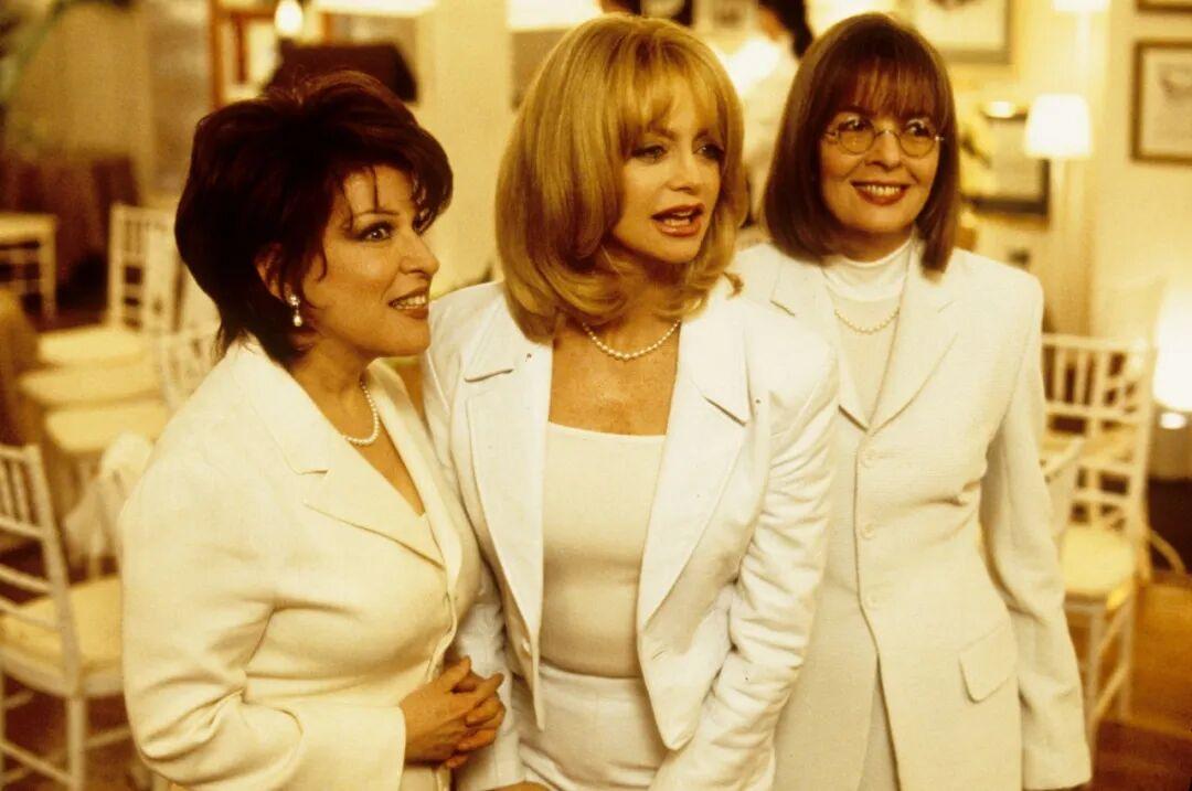 轉眼間到了90年代,她在電影《前妻俱樂部》中經典的白色西裝造型,貢獻了影史上精彩的一幕。最右爲黛安。▼