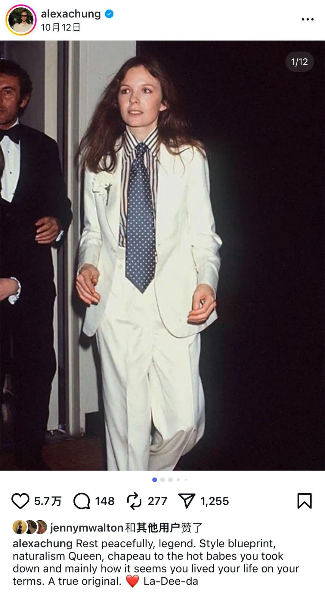 鍾小姐也發了一段文字緬懷她的偶像:安息吧,傳奇、風格典範、自然主義的女神。敬你是無法超越的時尚寵兒,更敬你能一直按照自己的方式生活。你是真正的開創者。愛你。▼