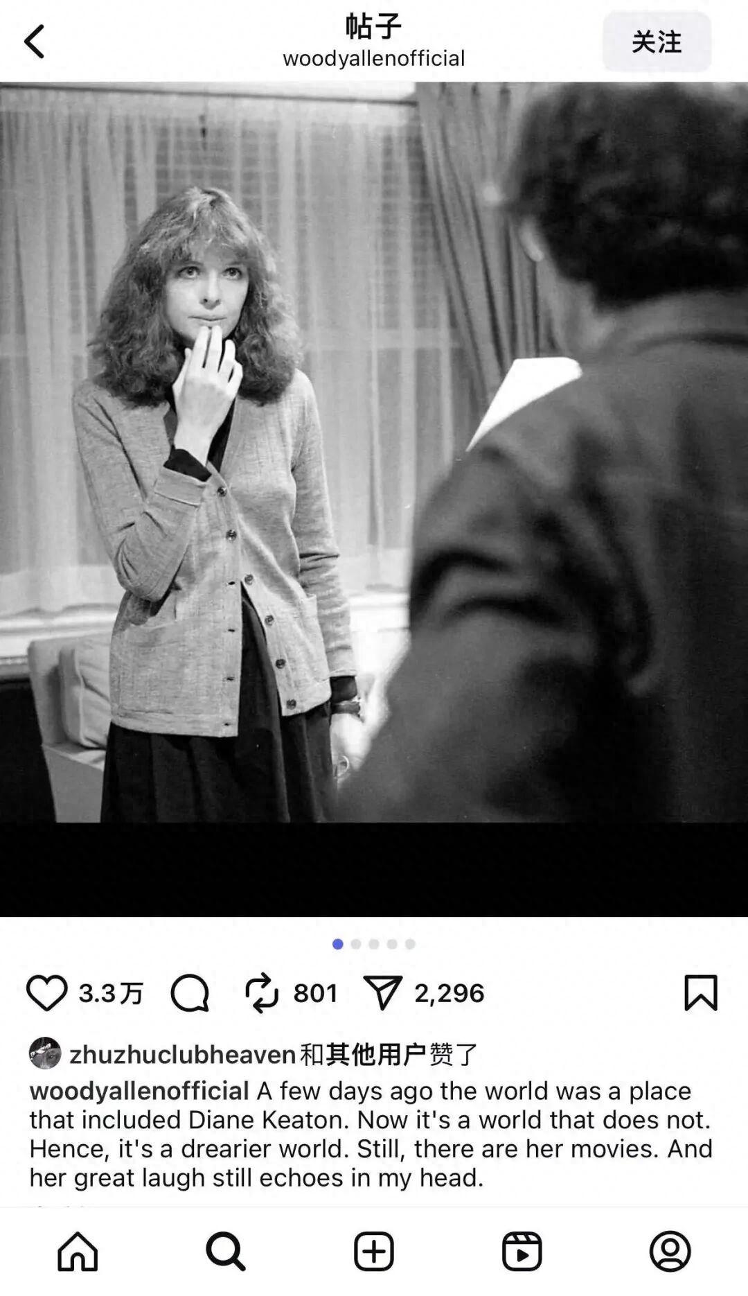 前段時間,79歲的黛安·基頓去世了,伍迪·艾倫撰文悼念她:“幾天前,這個世界上擁有基頓,現在她不在了,世界也因此變得更沉悶。好在,有她的電影。她的笑聲依舊迴盪在我的腦海中。”▼