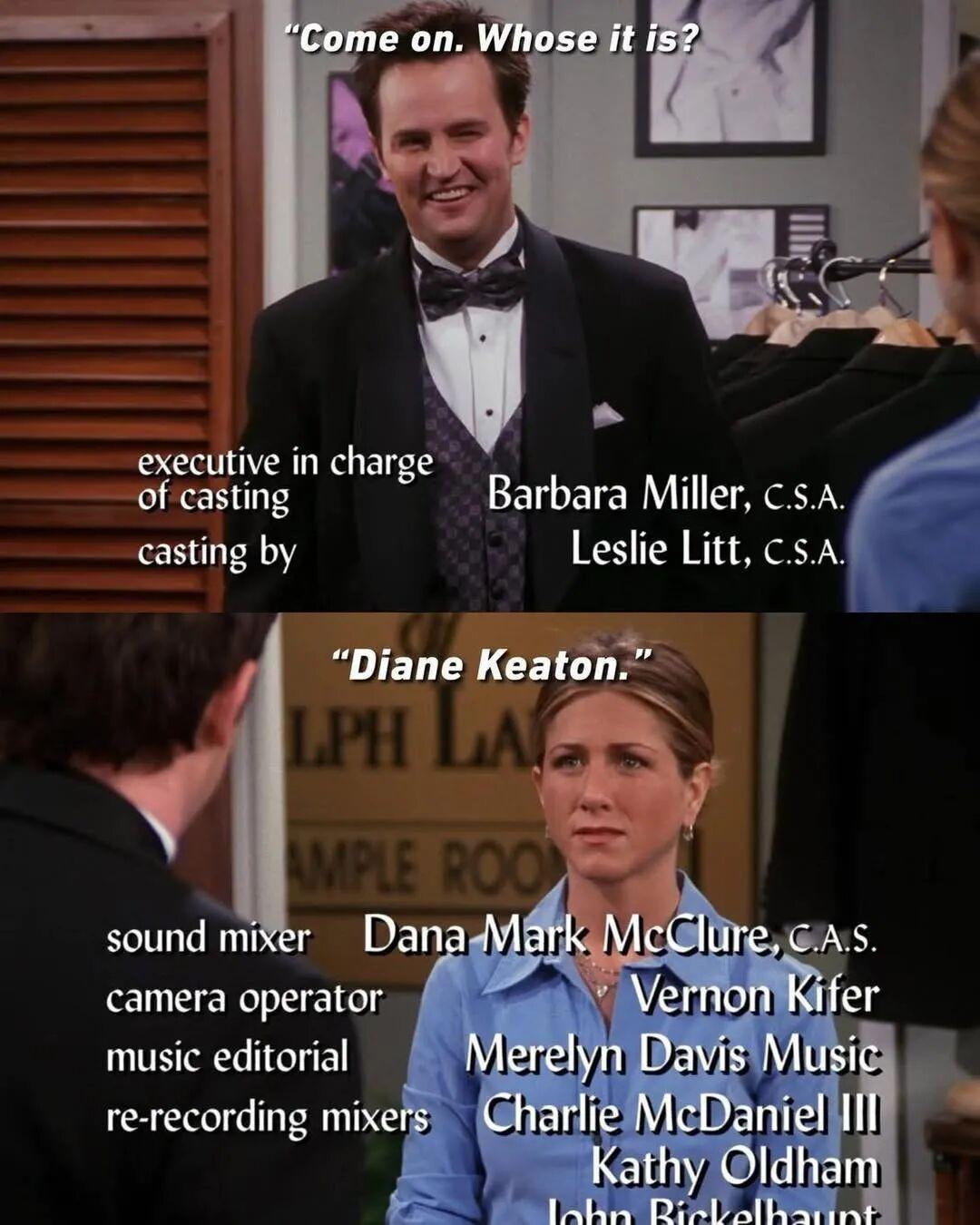 當時錢和莫在準備結婚禮服,原本是007西裝,覺得不夠酷,後來莫妮卡找來另一套,一致覺得效果很好,錢德勒問是誰的,莫妮卡說是黛安·基頓的~哈哈。▼