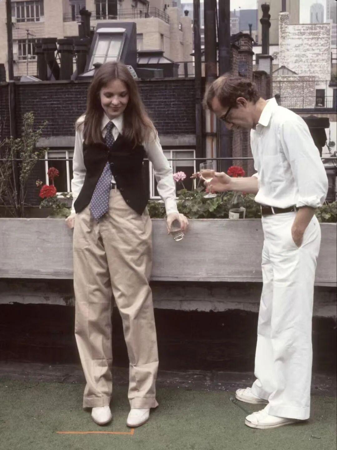 她在穿衣態度上也是如此。《安妮·霍爾》上映時是1977年,她在裏穿着白襯衫、領帶、馬甲、寬寬大大的褲子,徹底顛覆了人們對“女主角”的想象,也跟當時70年代電影的潮流相去甚遠。▼